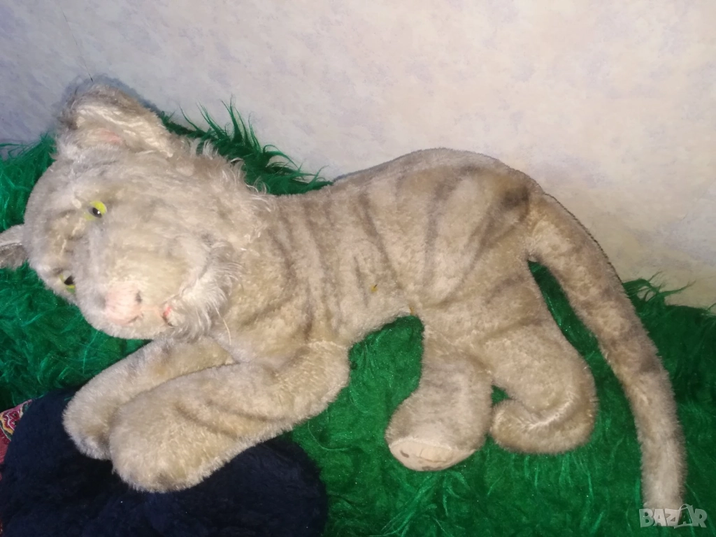 Стара колекционерска играчка тигър периода около 60-70 години.Материалът е стръхав плат с груби власинки/, пълнежът е твърд - дървени трици 16 евро