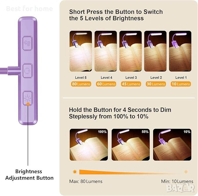 Презареждаема и дълготрайна: Вградената батерия с висок капацитет 1200 mAh, лампата за четене може да ви осигури 8-80 часа дълготрайна светлина. Необходими са само два часа за пълно зареждане, а 4 LED индикатора показват нивото на мощност в реално време.