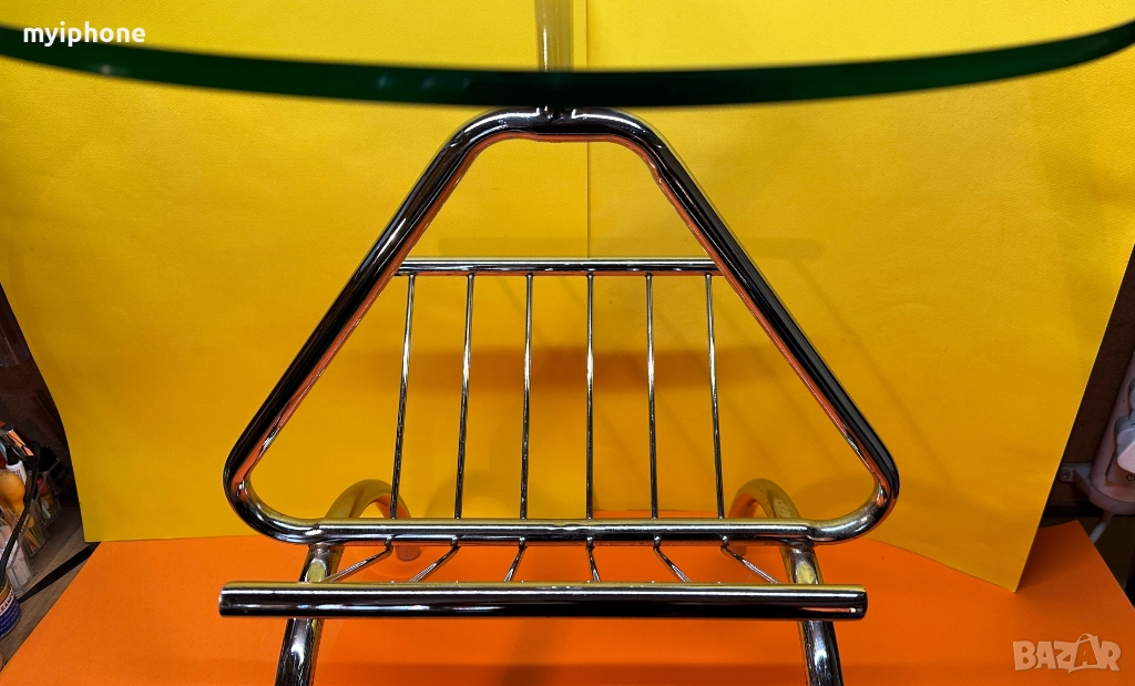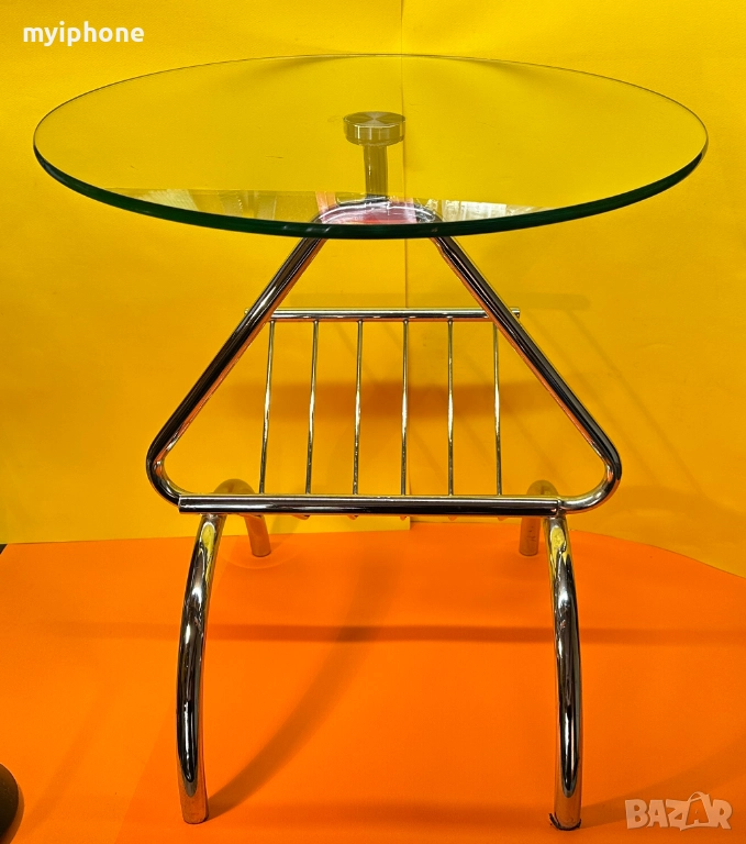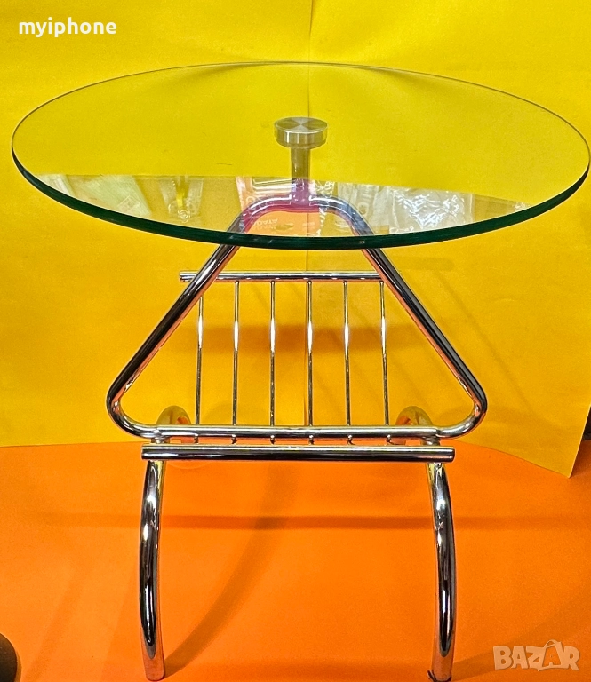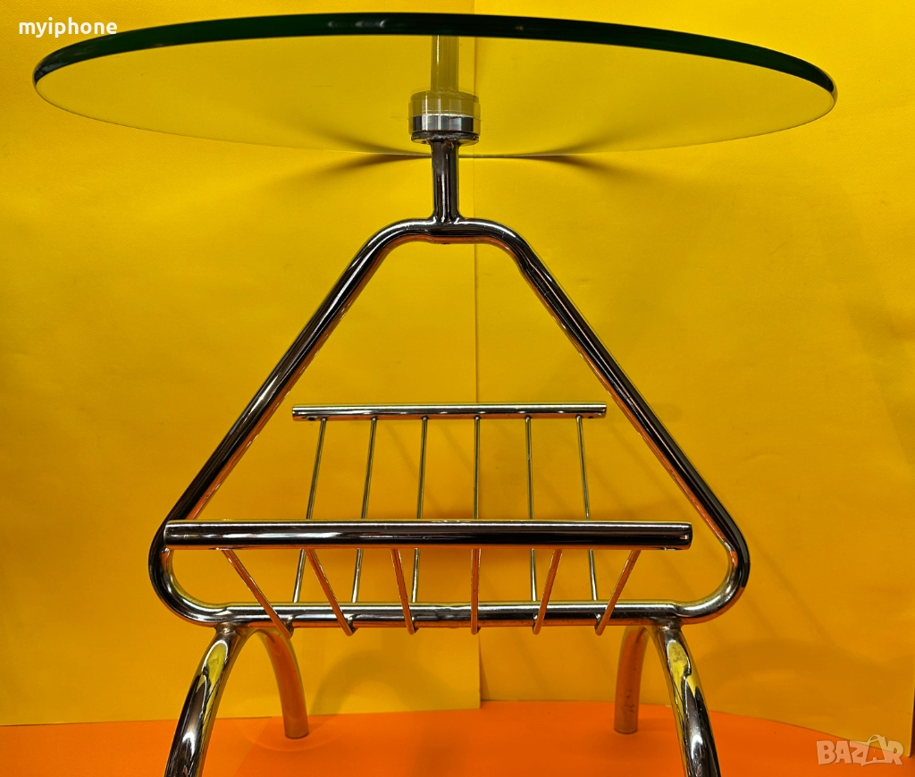 Стъклена маса в стил средата на века върху метална основа с вградена поставка за списания. Идеална за употреба в хол като странична маса със поставка за списания или масичка за кафе, или дори може да се използва като мини бар маса 56 см. висока* диаметър 50см.