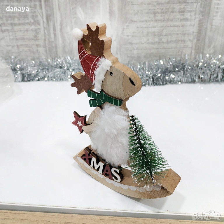 Фигурката стои стабилно върху извита дървена основа, която наподобява люлка и създава леко игрив ефект. Топлата дървесна текстура, шапката, шалът и малката звездичка добавят модерна рустик атмосфера, която се вписва както в класически, така и в скандинавски интериор. Подходящ избор за клиенти, които търсят лека, декоративна и лесна за комбиниране коледна украса.
