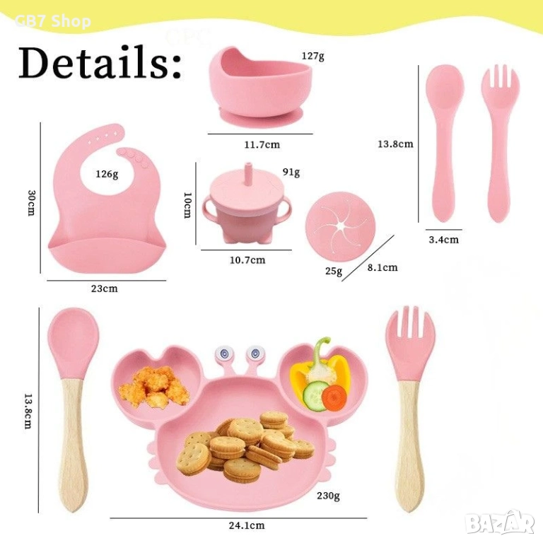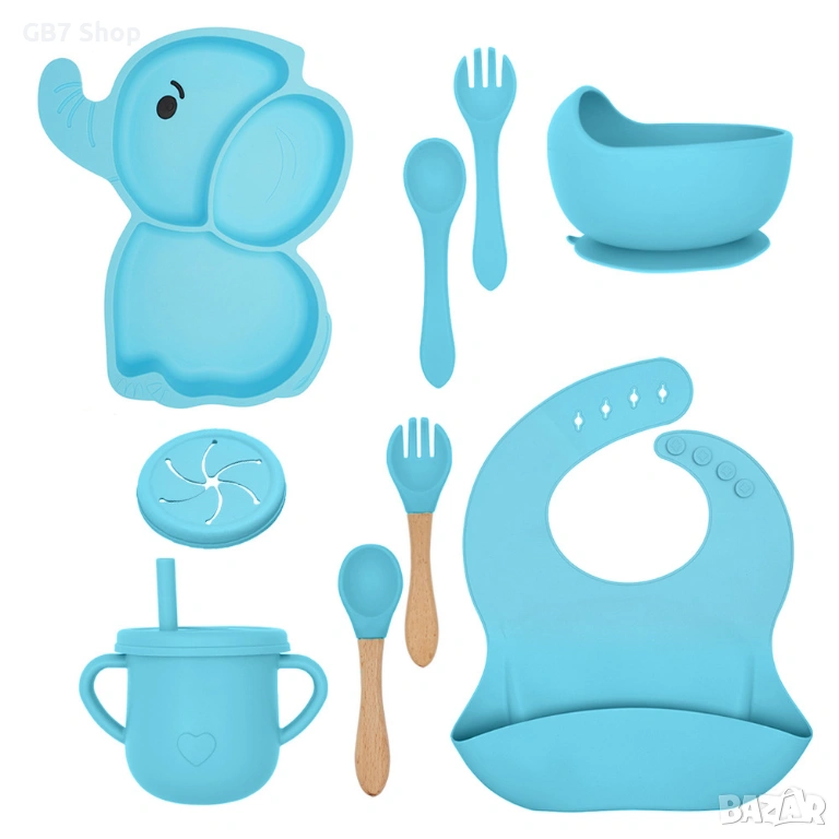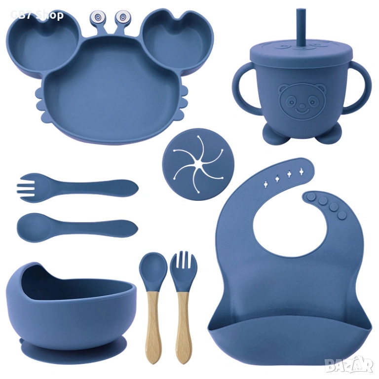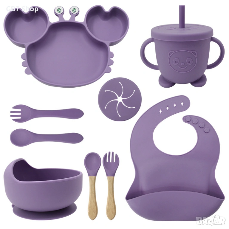 Този комплект от 9-части включва всичко необходимо – силиконов лигавник, преградна чиния, купа с вендуза, чаша с капак, силиконови и дървени прибори, без алергени. Безопасен, устойчив и лесен за почистване – идеален за всяко бебе!