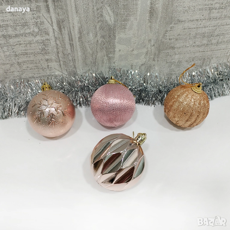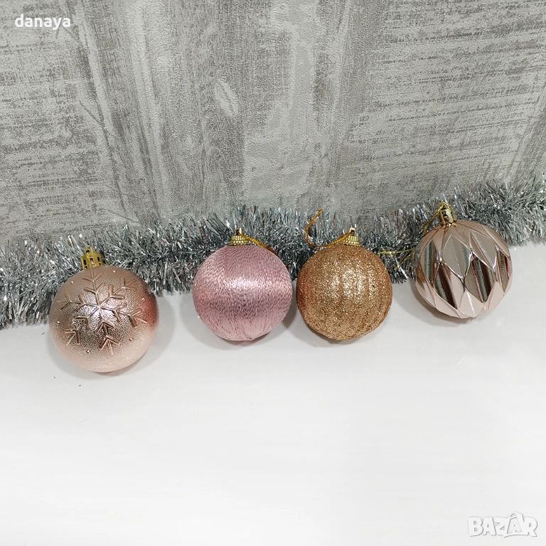 Благодарение на разнообразието от дизайни всяка топка допринася за завършена и хармонична коледна подредба. Цветът „розово злато“ е сред най-търсените за модерна празнична декорация, защото се съчетава отлично с бяло, зелено, бронз, сребро и топли неутрални тонове. Подходящи са както за естествени, така и за изкуствени елхи, гирлянди, венци, декоративни аранжировки и празнични кутии за подаръци.