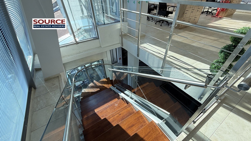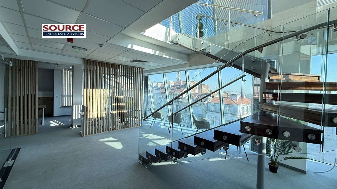 2. Разпределение: Панорамен офис, разположен на два офисни етажа, свързани помежду си с вътрешна стълба, с общо разпределение както следва: 2 големи Open space помещения, 3 отделни работни помещения преградени със стъклени и гипсокартонени преградни стени, 1 колруум, рецепция, оборудвана кухня с трапезария, рецепция, 4 wc, 3 тераси. Офисът може да бъде изцяло с Open space разпределение или допълнително преграден според изискванията на Наемателя.