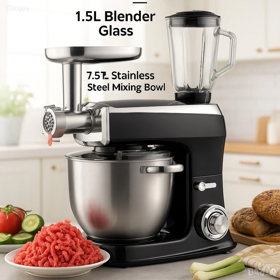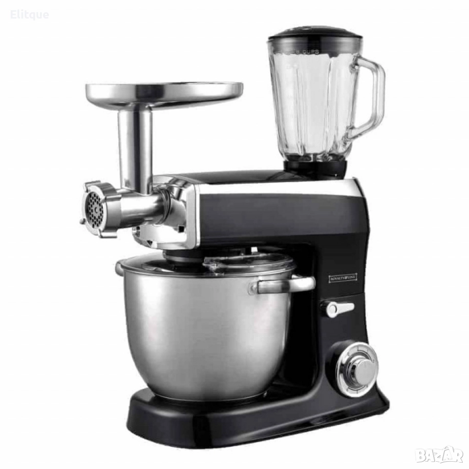 Марка: Royalty Line; Мощност: 2100 W (макс.); Напрежение: 220–240V ~ 50/60Hz; Купа: 7.5 L, неръждаема стомана + капак против пръски; Блендер: 1.5 L, стъклен; Приставки: месомелачка + дискове, телена бъркалка, плоска бъркалка, кука за тесто; Скорости: наклонени степени + планетарно разбъркване; Размери: 39 см; Гаранция: 12 месеца.
