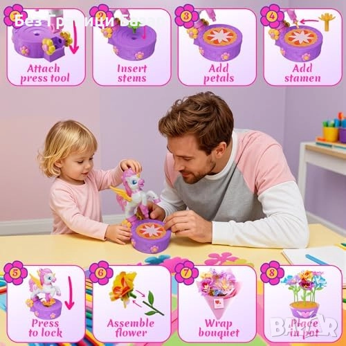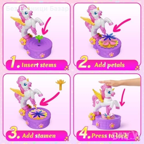 Включва преса за цветя с форма на еднорог, цветни платнени венчелистчета, вази и основи.