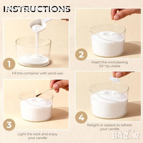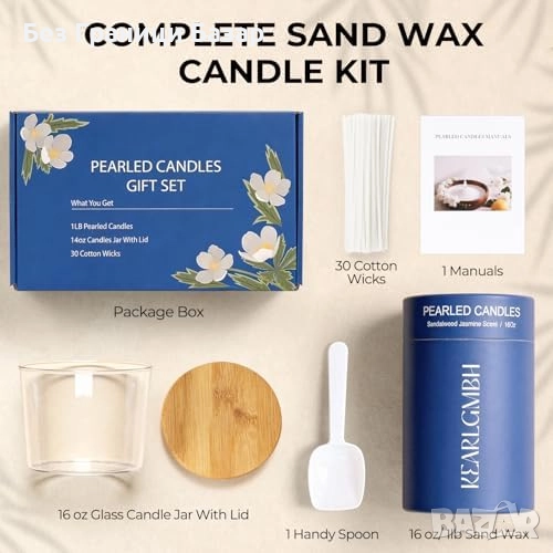 Включва 450 г восък, 30 фитила, лъжица и елегантен 475 мл стъклен буркан с дървен капак