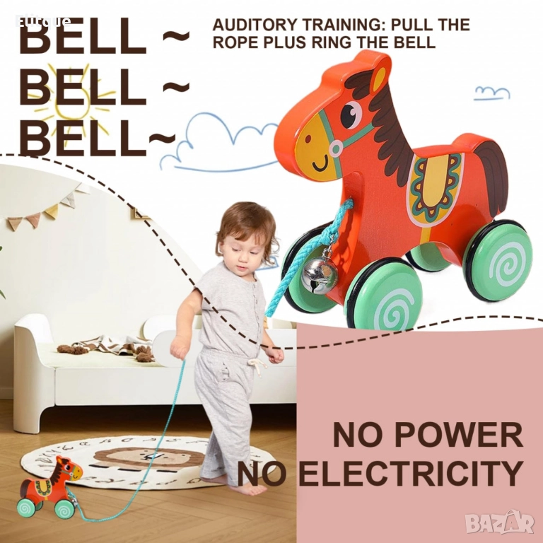 Играчката за дърпане/бутане е изработена от дърво и е идеална за малки деца, които започват да развиват координация и двигателни умения. Със своите весели цветове и забавни форми, тя привлича вниманието и стимулира въображението на детето. Връвчицата позволява лесно дърпане или бутане, като така детето се учи на баланс и движение.