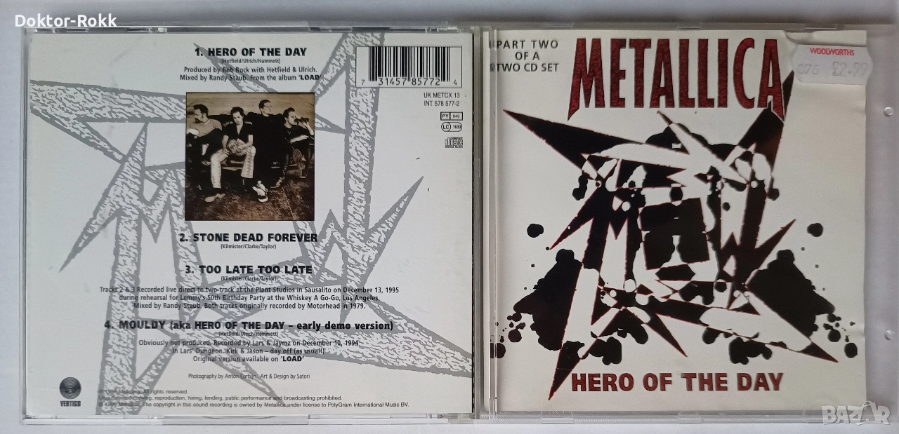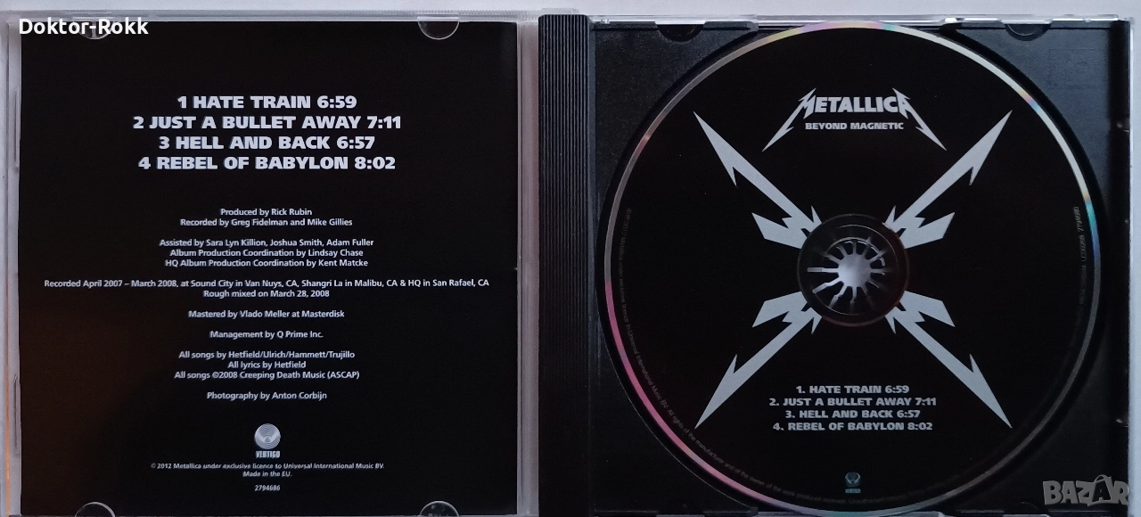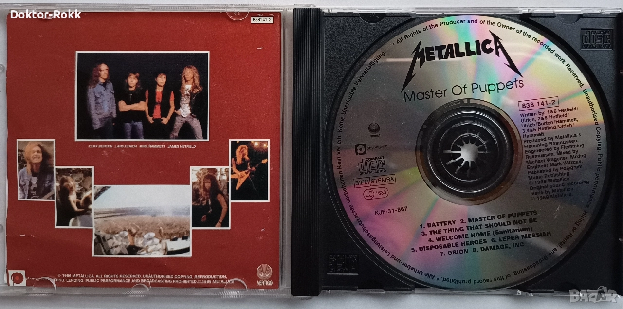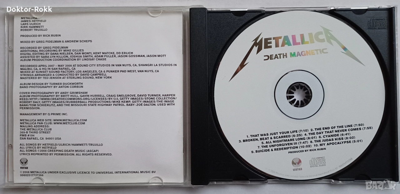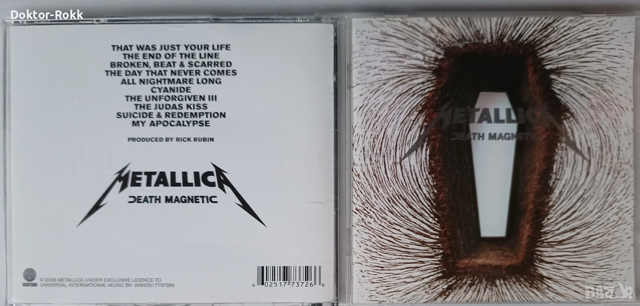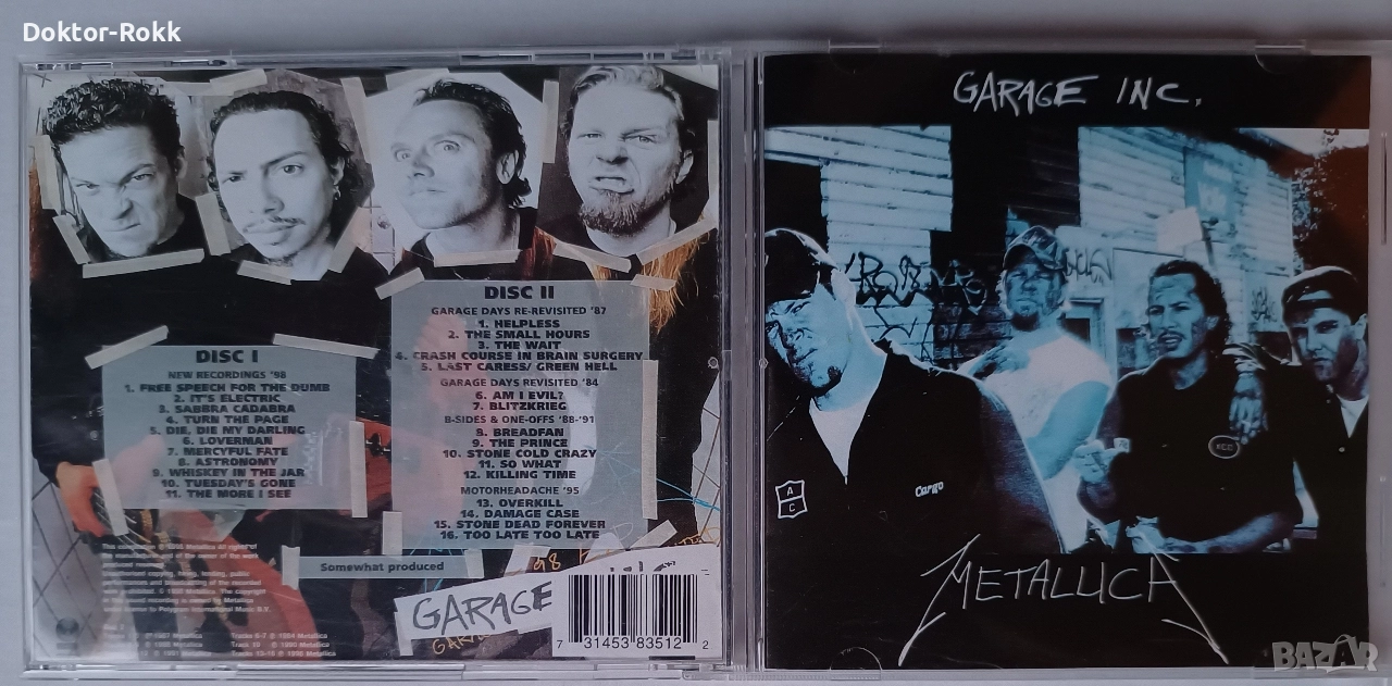 дискове на Металика: 1,/ Beyond Magnetic 2012 - оригинален, 20 лв.; 2./ Garage Inc. 1987 / 1998, 2 CD - неофициален двоен използван диск, 20 лв ; 3./ Death Magnetic 2008, оригинален използван диск, 25 лв.; 4./ Hero of the Day - оригинален използван диск, 20 лв.; 5./ Kill em All 1983 / 1989 - оригинален използван диск, 26 лв.; 6./ Master of Puppets 1986 / 1989 - оригинален използван диск, 28 лв.; 7./ Best Ballads - неофициален като нов диск, 12 лв.
