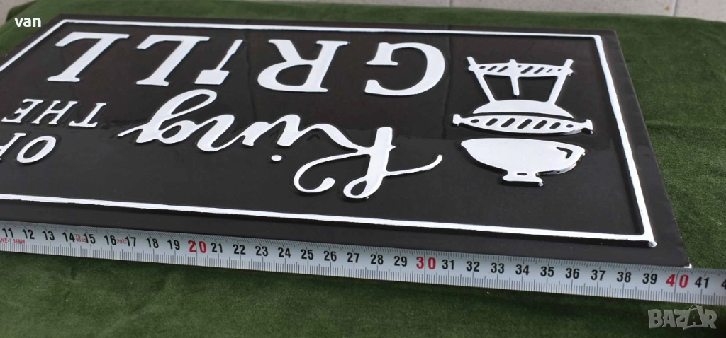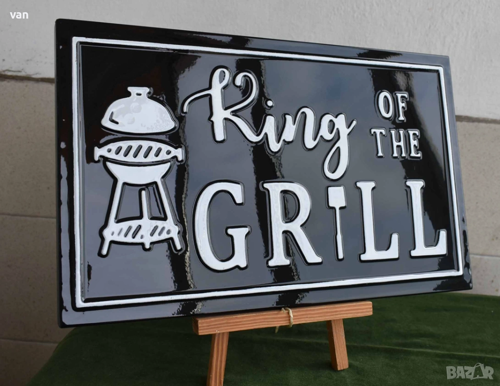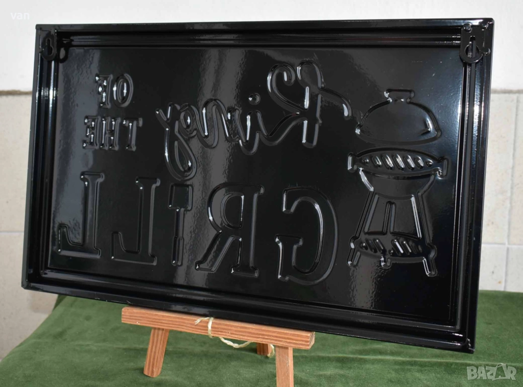 Нова емайлирана табела King of the Grill, буквите са релефни (повдигнати), без забележки. Без пробиване – има планки за окачване.