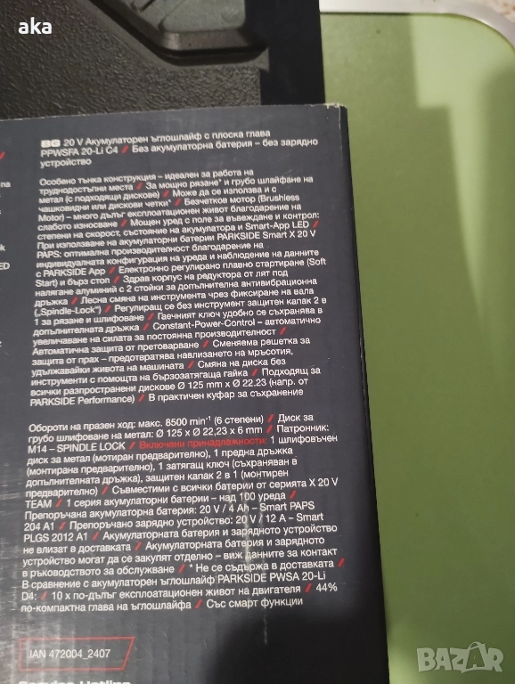Особено тънка конструкция идеален за работа на труднодостъпни места За мощно рязане" и грубо шлайфане на метал (с подходящи дискове) Може да се използва и с чашковидни или дискови четки" Безчетков мотор (Brushless Motor) - много дълъг експлоатационен живот благодарение на слабото износване Мощен уред с поле за въвеждане и контрол: степени на скорост, състояние на акумулатора и Smart-App LED/При използване на акумулаторни батерии PARKSIDE Smart X 20 V PAPS: оптимална производителност благодарение на индивидуалната конфигурация на уреда и наблюдение на данните C PARKSIDE Apр Електронно регулирано плавно стартиране (Soft Start) и бърз стоп Здрав корпус на редуктора от лят под налягане алуминий с 2 стойки за допълнителна антивибрационна дръжка Лесна смяна на инструмента чрез фиксиране на вала (Spindle-Lock") / Регулиращ се без инструмент защитен капак 2 в 1 за рязане и шлифоване Гаечният ключ удобно се съхранява в Constant-Power-Control- автоматично Сменяема решетка за допълнителната дръжка увеличаване на силата за постоянна производителност Автоматична защита от претоварване защита от прах предотвратява навлизането на мръсотия, Смяна на диска без Подходящ за удължавайки живота на машината инструменти с помощта на бързозатягаща гайка всички разпространени дискове Ø 125 mm х 0 22.23 (напр. от PARKSIDE Performance) / B практичен куфар за съхранение