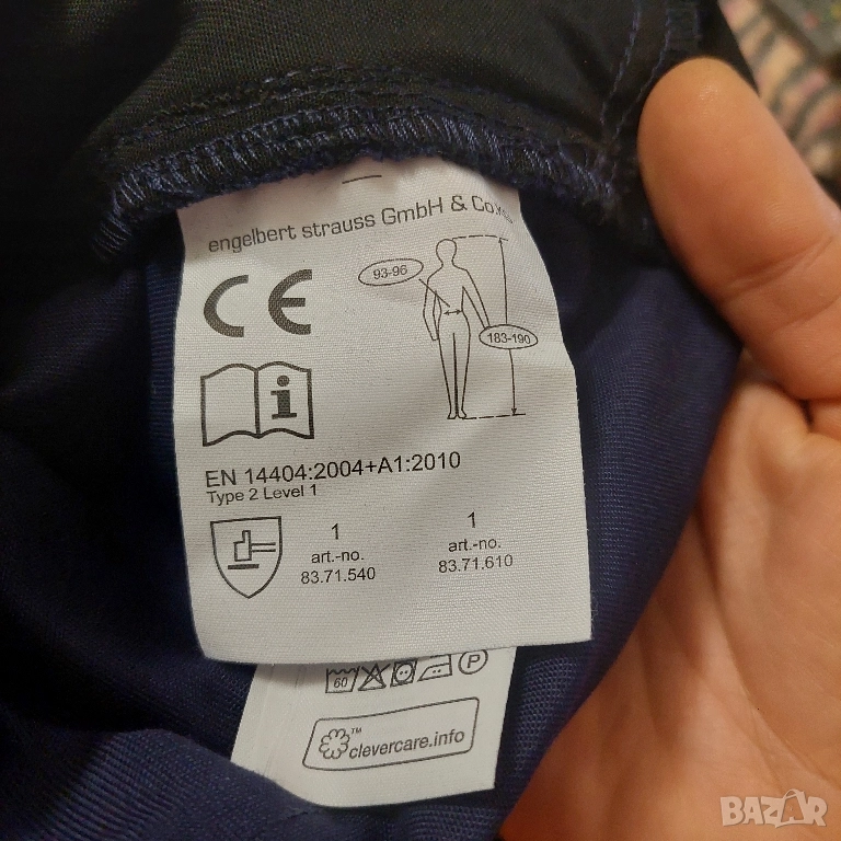 Тези панталони отговарят на изискванията на „Протектори за коляно за работа в коленичещо положение“ тип 2, ниво на производителност 1 съгласно DIN EN 14404:2004+A1:2010 в комбинация с наколенките e.s., които са сертифицирани за тази цел - вижте информационния лист!