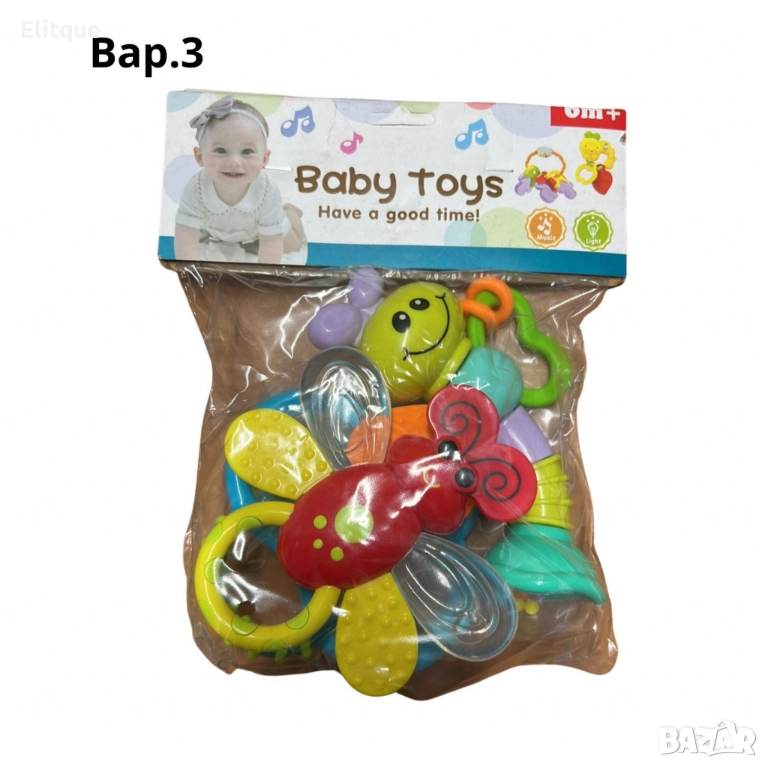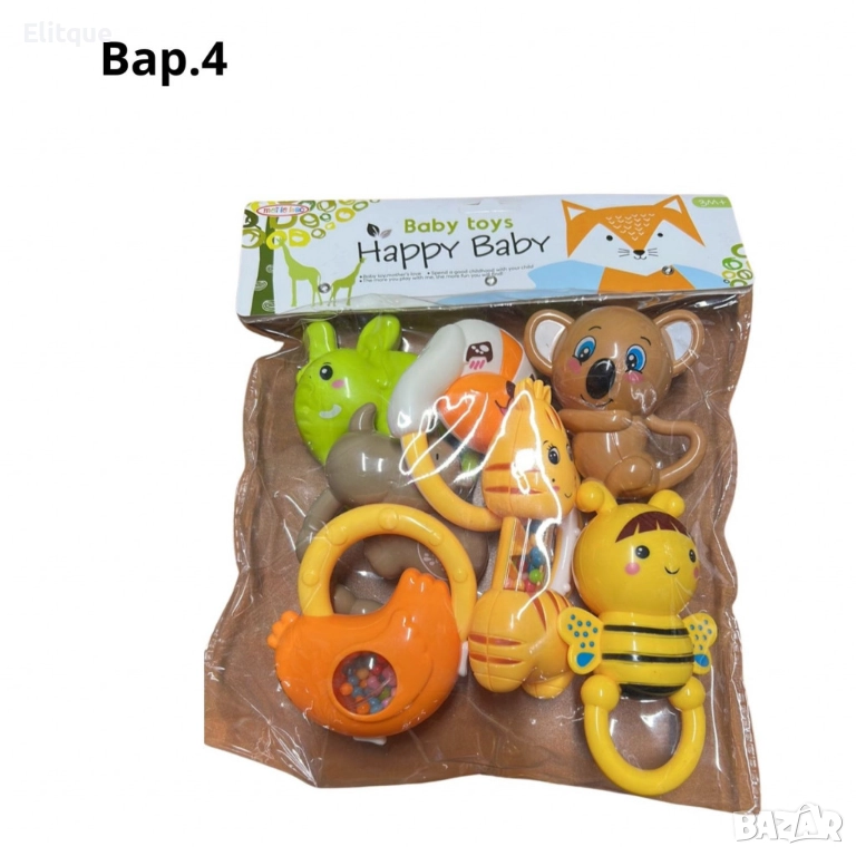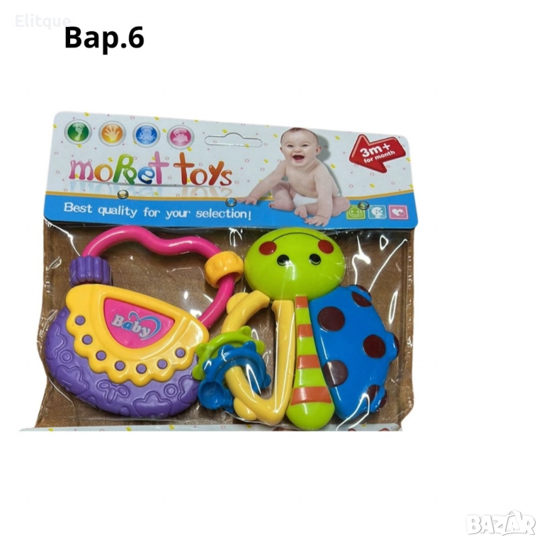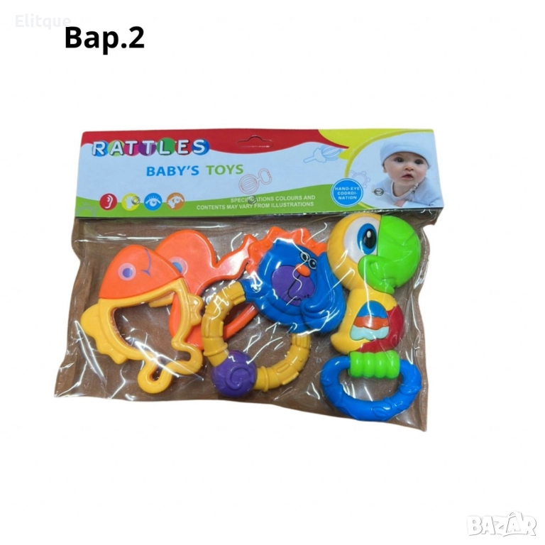 Бебешки дрънкалки от пластмаса с подвижни части, предназначени за развитие на моториката и слуха на малките деца. Те са лесни за хващане и предлагат забавление и стимулиране на сетивата. Възможни са в 6 различни варианта: