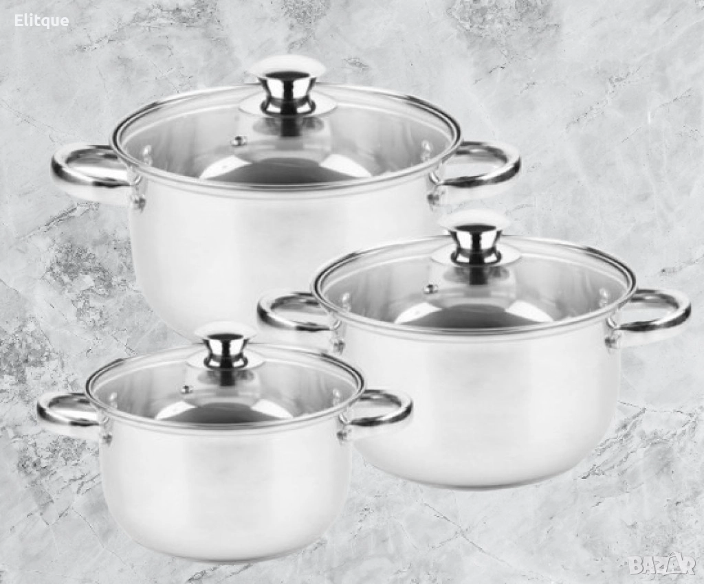 Комплект тенджери от висококачествена неръждаема стомана. Нитовани дръжки от неръждаема стомана за допълнителна стабилност. Капак от закалено стъкло с птвор за пара. Подходящи за газови, халогенни, електрически и стъкло- керамични котлони. Подходящи за почистване в съдомиялна машина.