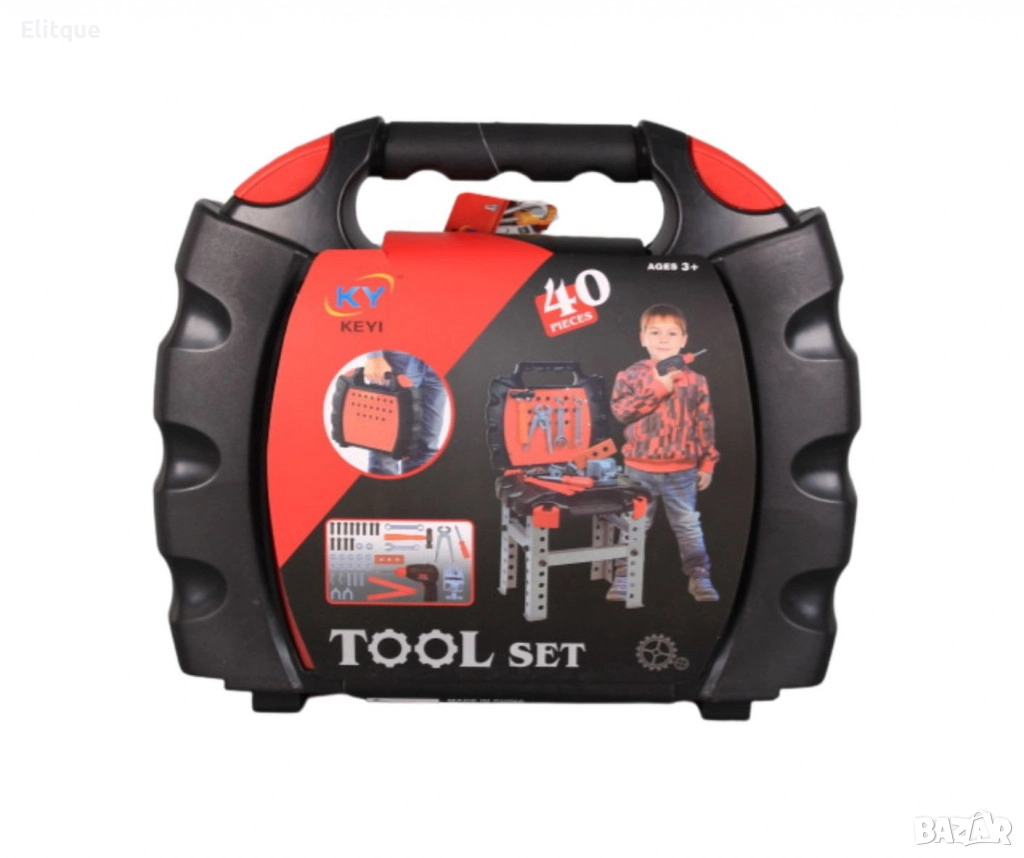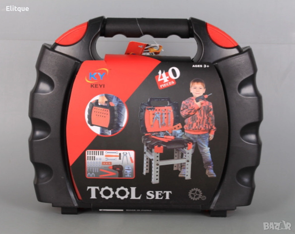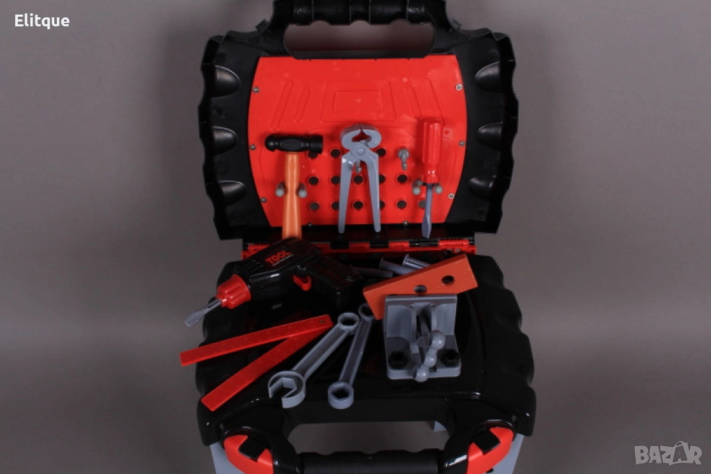 Комплектът включва всичко необходимо за малките майстори – куфар с работна маса и различни инструменти. В него ще намерите винтоверт с реална функция на въртене на свредела в две посоки, менгеме, чук, гаечен ключ и разнообразие от болтове, гайки и други аксесоари.
