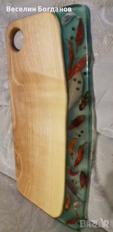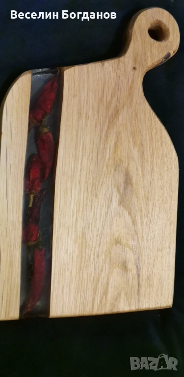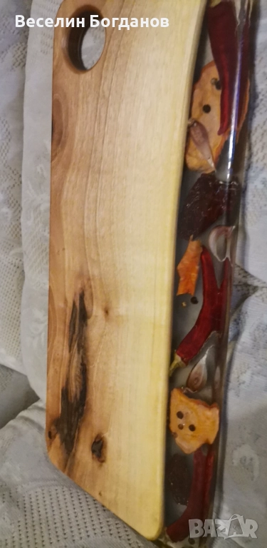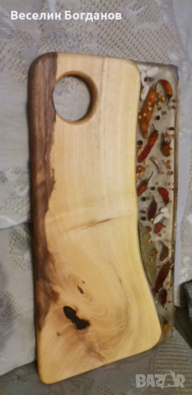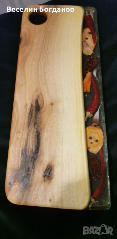 Дъски изработени от орех и епоксидна смола със заляти чушки, бобчета, черен пипер и др. Дървесината е обработена с масло за дърво Осмо. Практични за рязане и сервиране. Подходящи за уникален подарък. Весели празници.