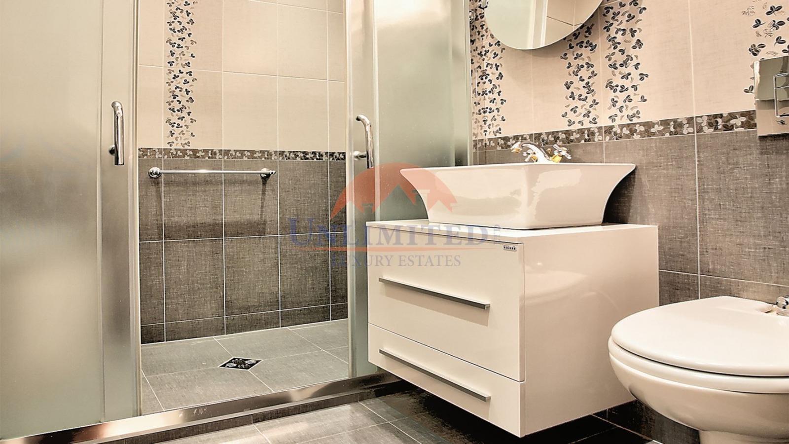 The bathrooms feature luxury tiles and designer fixtures, including a shower cabin and modern sanitary ware.