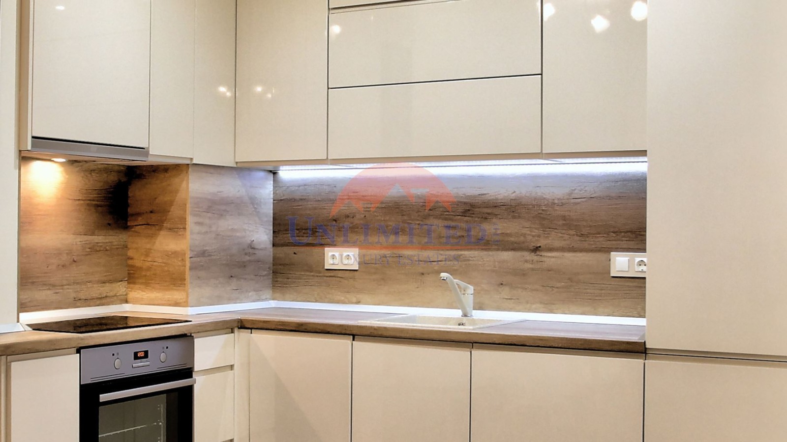 Дневната е просторна и светла, с големи прозорци до пода, комфортна мебелировка и климатик. Кухнята е в изчистен модерен стил, с гланцови повърхности и висок клас уреди. Спалните са стилно обзаведени, с големи гардероби и качествени легла, осигуряващи максимален комфорт и уют.