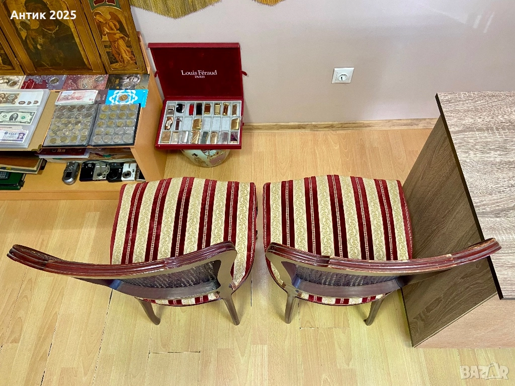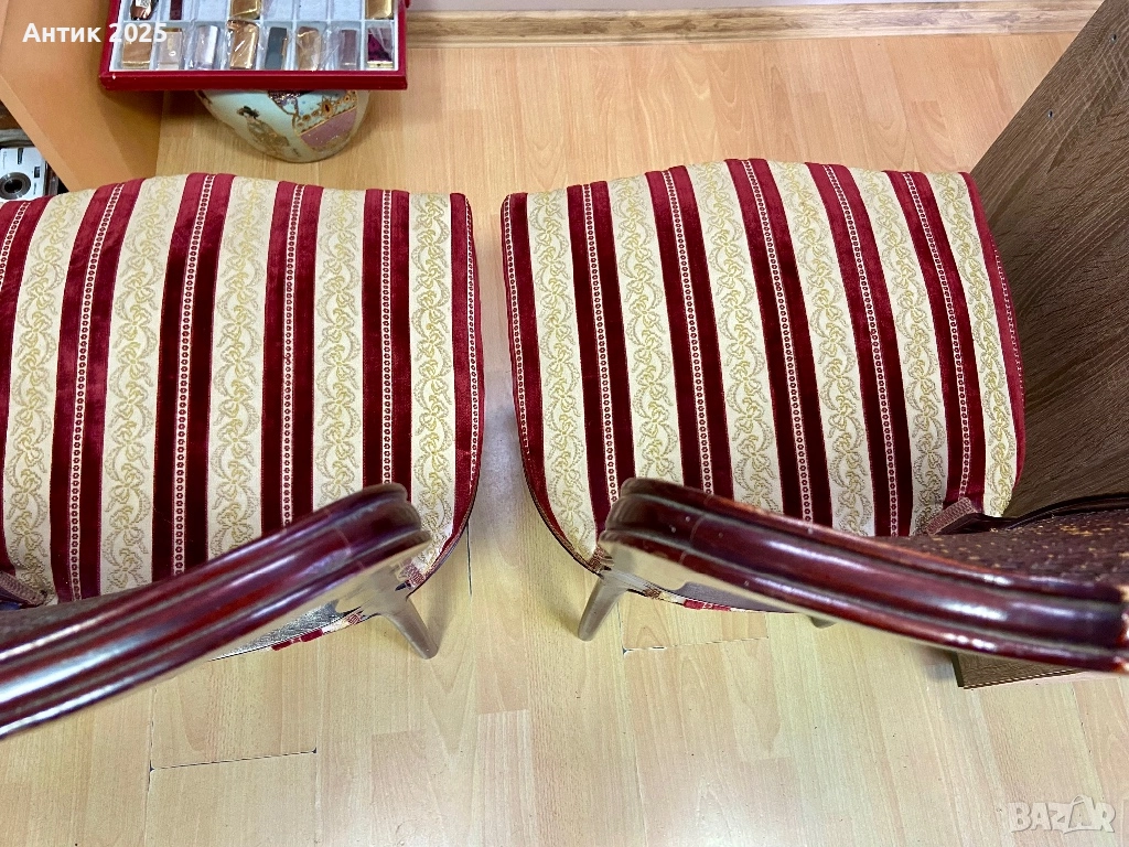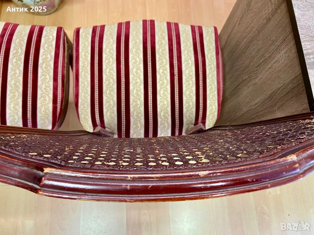 дамаска с класически бордо-златен раиран десен – плътна и удобна материя, която подчертава винтидж характера на стола. Подходящ за дневна, спалня, кабинет или фотостудио, както и като акцент в интериор с класически, античен или френски стил. Състоянието е добро, конструкцията е здрава, плетката – цяла. Цена за един стол: 200 лв.