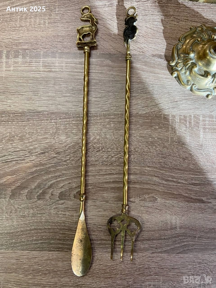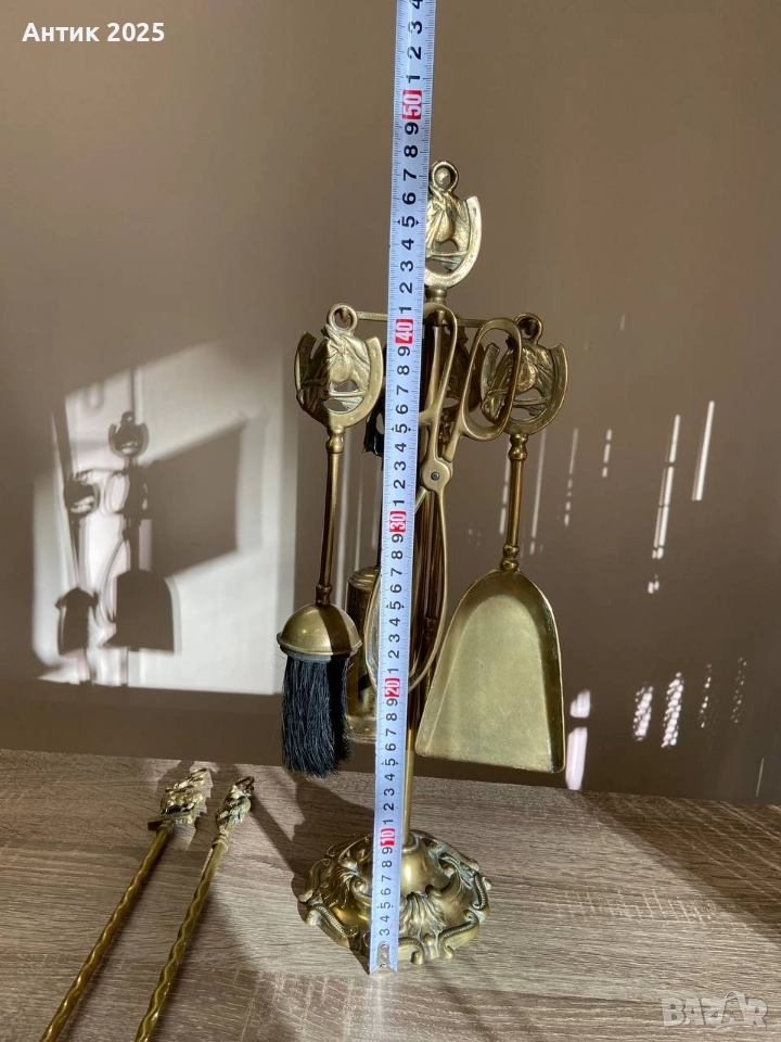 лопатка, щипки, ръжен, четка и стойка. Декориран с фигурни елементи и изработен от масивен месинг. Има красива естествена патина, която подчертава възрастта и стила на предмета. Комплектът е напълно функционален и подходящ както за използване до камина, така и като стилен декоративен акцент в дома, кафене или къща за гости. Към комплекта подарявам месингова лъжица за обувки и масажор/чесалка за гръб – в същия стил. Състоянието е добро, всичко е оригинално.