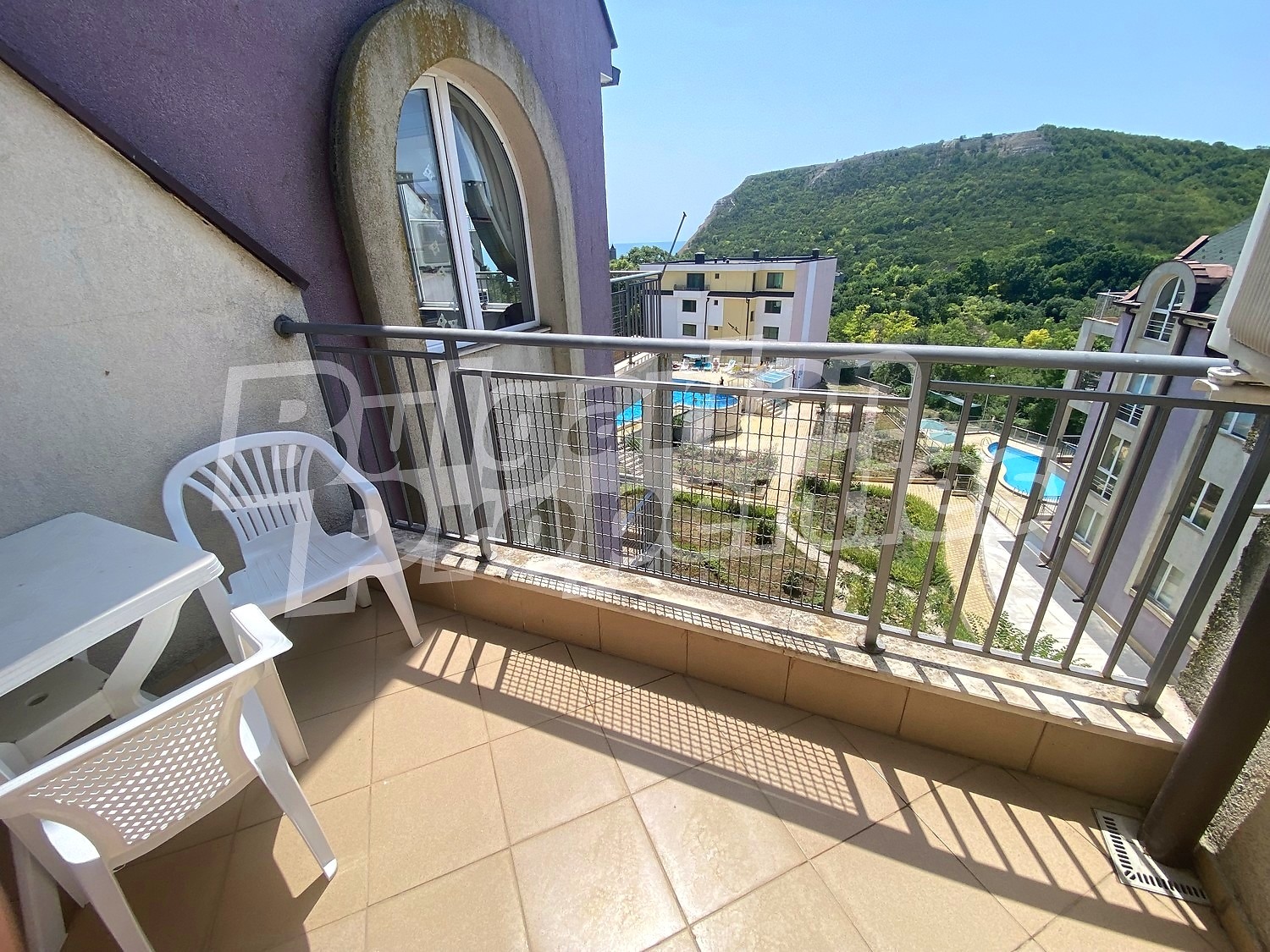 Две тераси с гледка към зеленина, вътрешен двор с басейн и морето