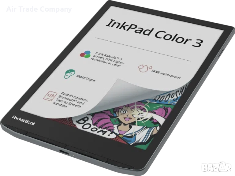 PocketBook InkPad Color 3 е оборудван с най-новия 7,8-инчов цветен E Ink Kaleido™ 3 дисплей, който предлага 50% по-добра разделителна способност и повишено PPI за по-ясни и живи електронни страници. Този екран е напълно безопасен за очите и елиминира отблясъците, като предоставя идеален размер за разнообразно съдържание – книги, манга, комикси и учебници.