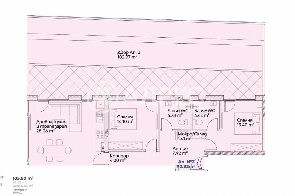 Тристаен апартамент с РЗП-105,60м2, ЗП-92,33м2 със следното разпределение: на ниво партер са разположени: антре, дневна с трапезария и кухненски бокс- 28,06м2, веранда и двор-102,97м2, две спални -13,40м2 и 14,10м2, две бани с тоалетни - 4,42м2 и 4,78м2. Изводи за термопомпа, при желание може и подово отопление. Подземни ПМ и гаражи.