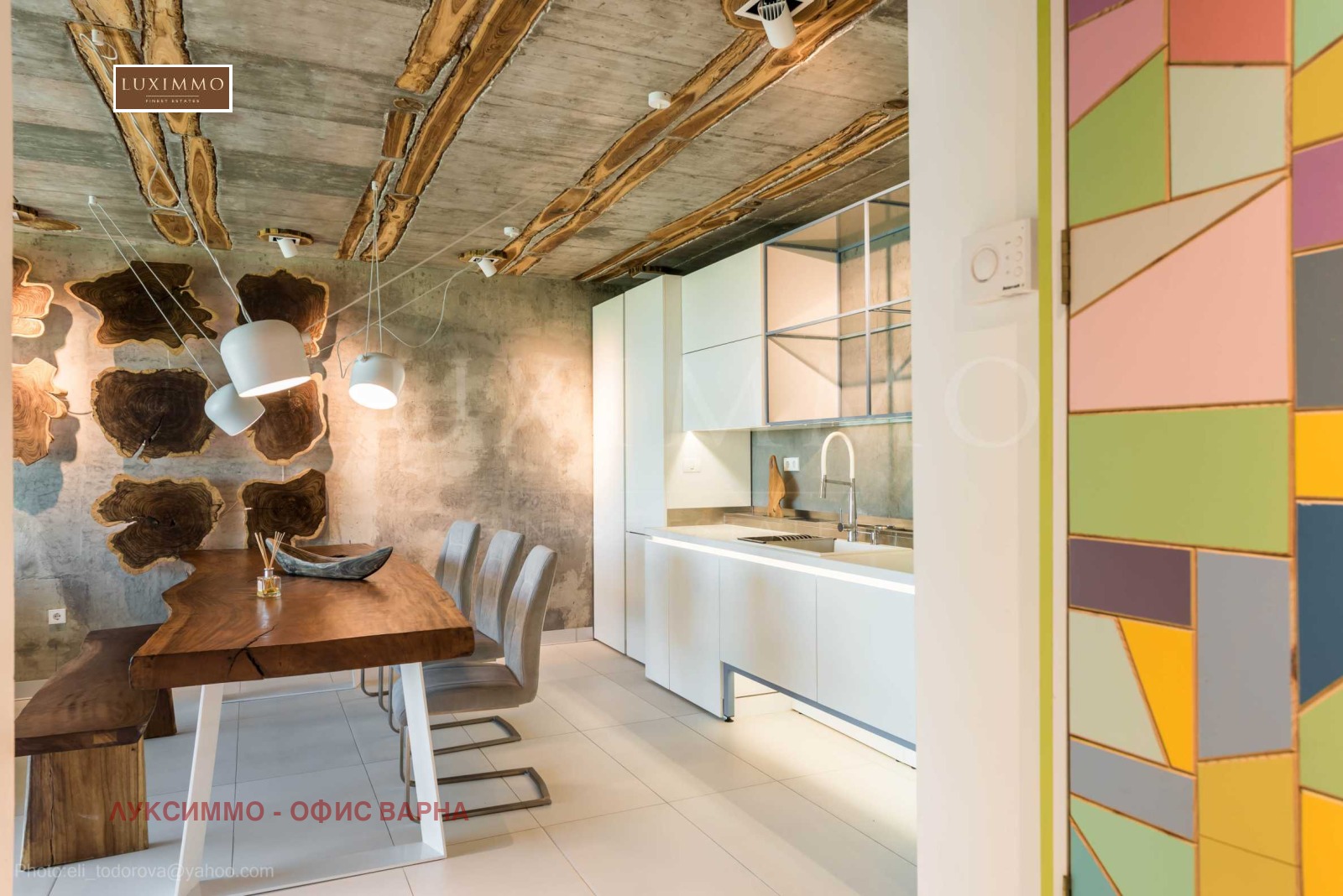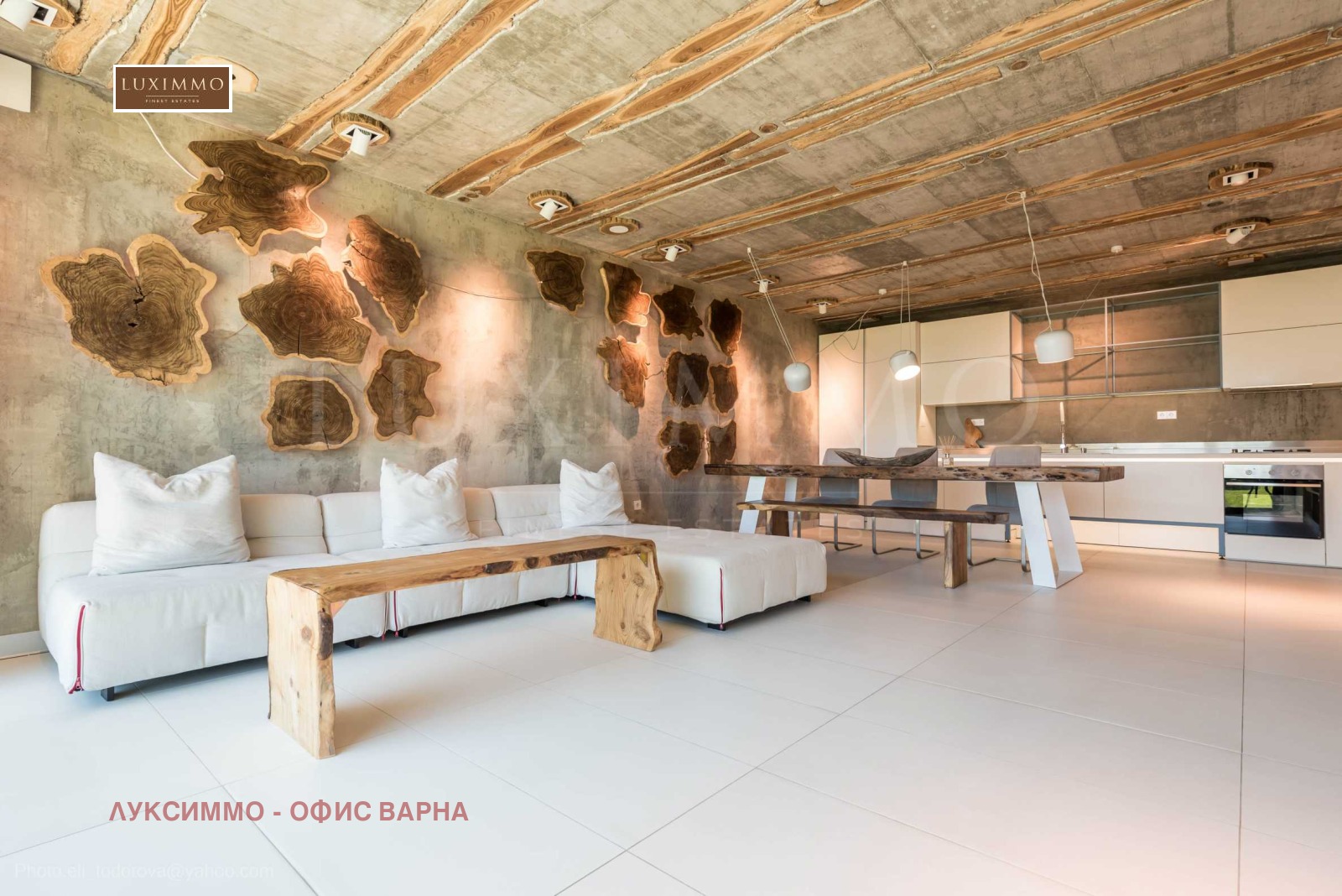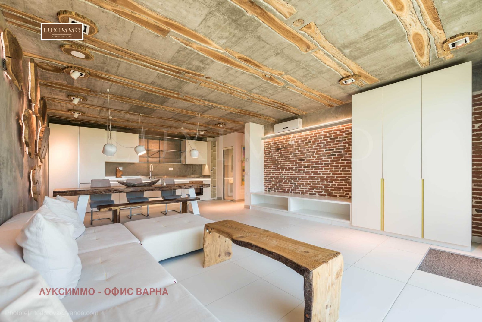 Дизайнът е уникален - естествен и модерен, предизвикателен и светъл, носещ посланието на автономност, релакс и морската атмосфера. В бетоновите плочи по тавана на апартамента са вградени естествени дървени орнаменти от акация. Тухлените стени и бетонът са използвани за естествена декорация, като са допълнително обработени, импрегнирани и грундирани. Мебели, кухня, матраци и дивани, атрактивни плочки, осветителни тела - всички са на известни италиански марки. Вниманието в трапезария е с акцент на екстравагантната маса, изработена по поръчка, от ценно и рядко дърво от Амазонка. Банята е отделена със стъклена врата, за изобилието на слънчева светлина, а всички санитарии са първокласно немско качество.