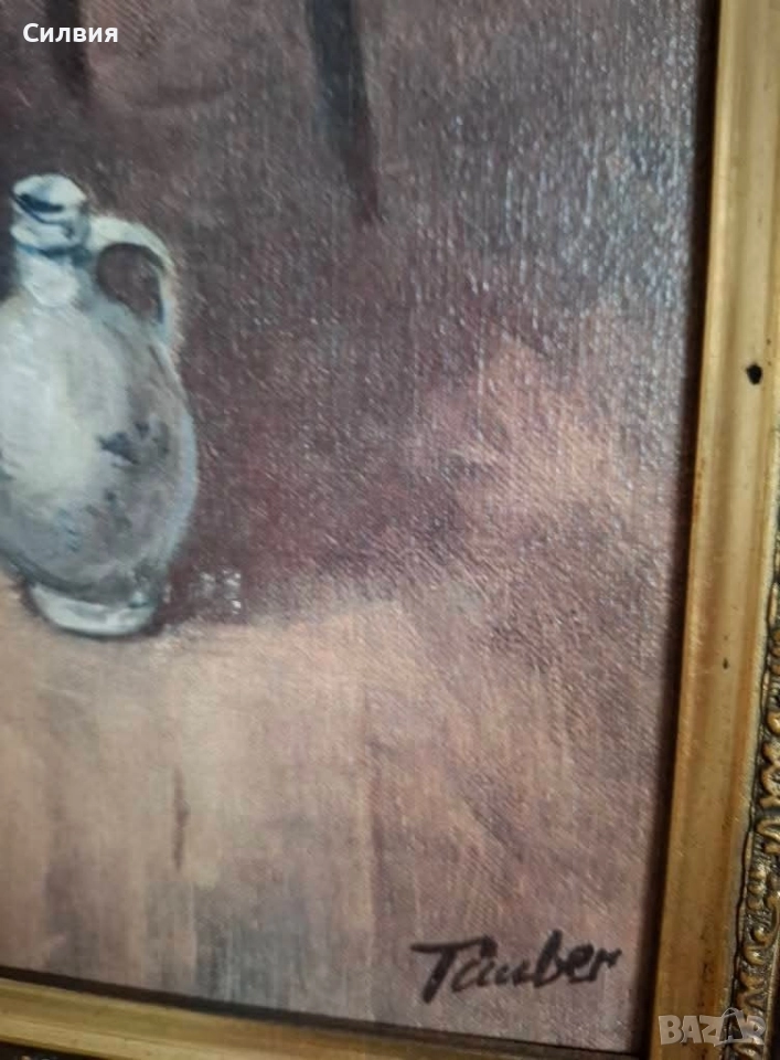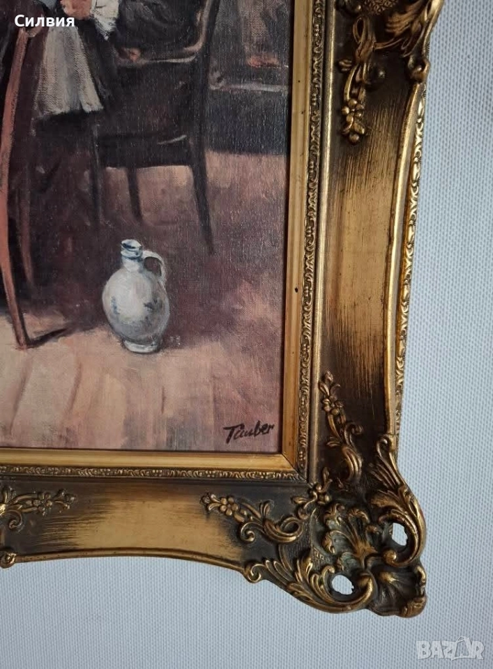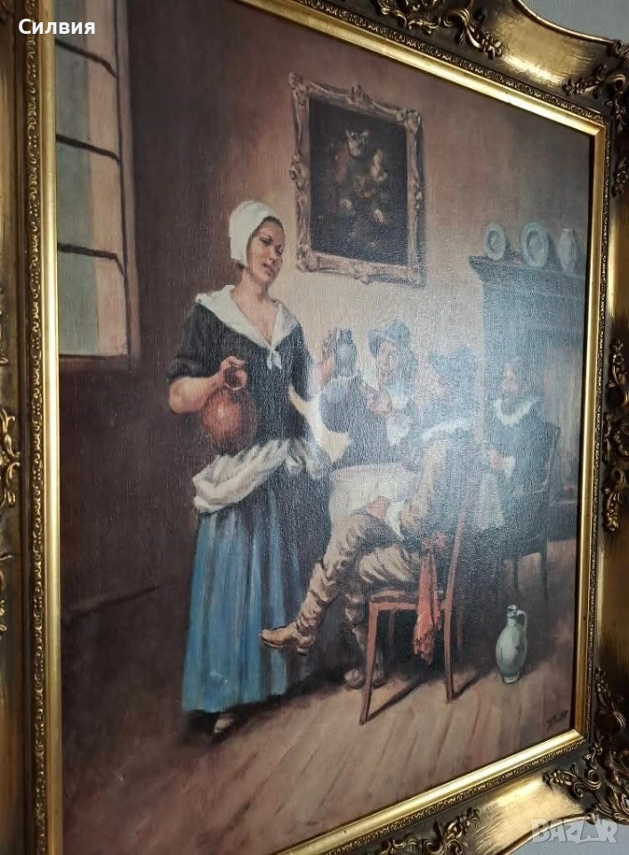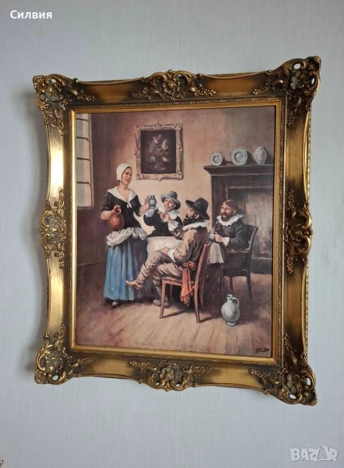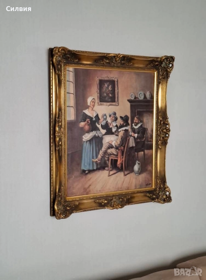 Елегантна Картина "Холандски Бит" с Богато Орнаментирана Златна Рамка.