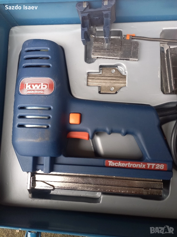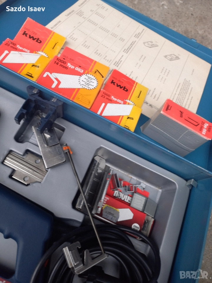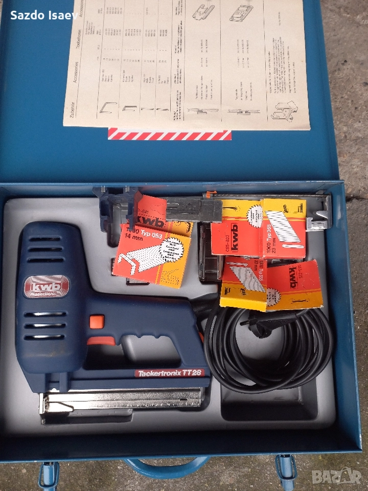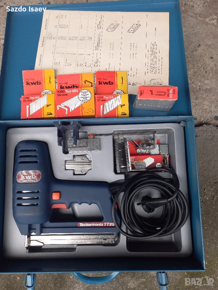 електрически такер Kwb машината е нова в метална кутия и пълни кутии с кламери