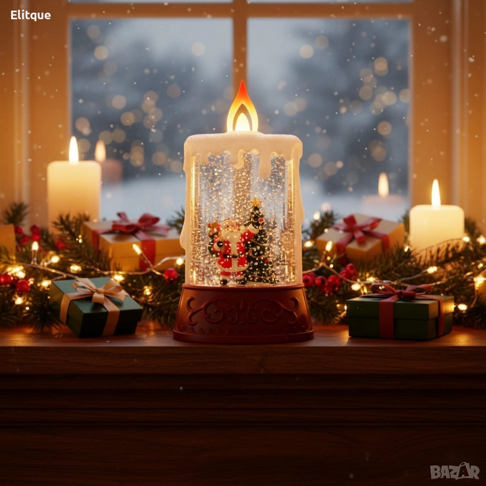 Материали: издръжлива пластмаса с висококачествени детайли и пайети; Размери: 8 см ширина х 14,5 см височина; Светлина: топло LED осветление, безопасно и без нагряване; Захранване: 2 x AAA батерии (не са включени); Безопасност: без пламък, без риск от пожар; подходяща за домове с деца и домашни любимци; Допълнителни елементи: декоративна фигурка на Дядо Коледа и коледна елха; Подходяща за деца: да, безопасна и устойчива; Използване: идеална за коледна украса, новогодишни партита, подаръци, офис декор; Гаранция: 12 месеца.