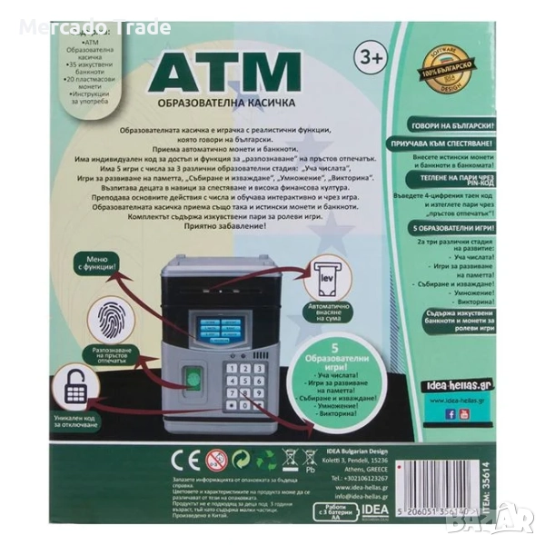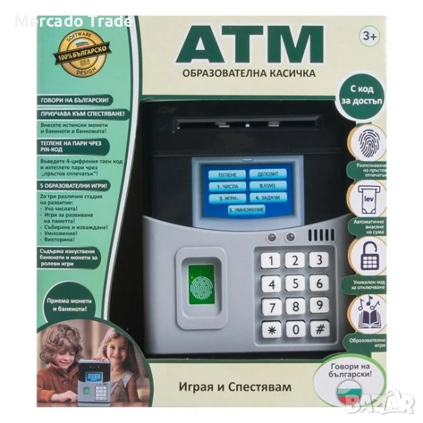 ATM касичката е електронна образователна играчка, която работи като истинска и говори на български език. Приема автоматично банкноти и монети, разполага с персонален PIN код и се отваря чрез „разпознаване“ на пръстов отпечатък.
