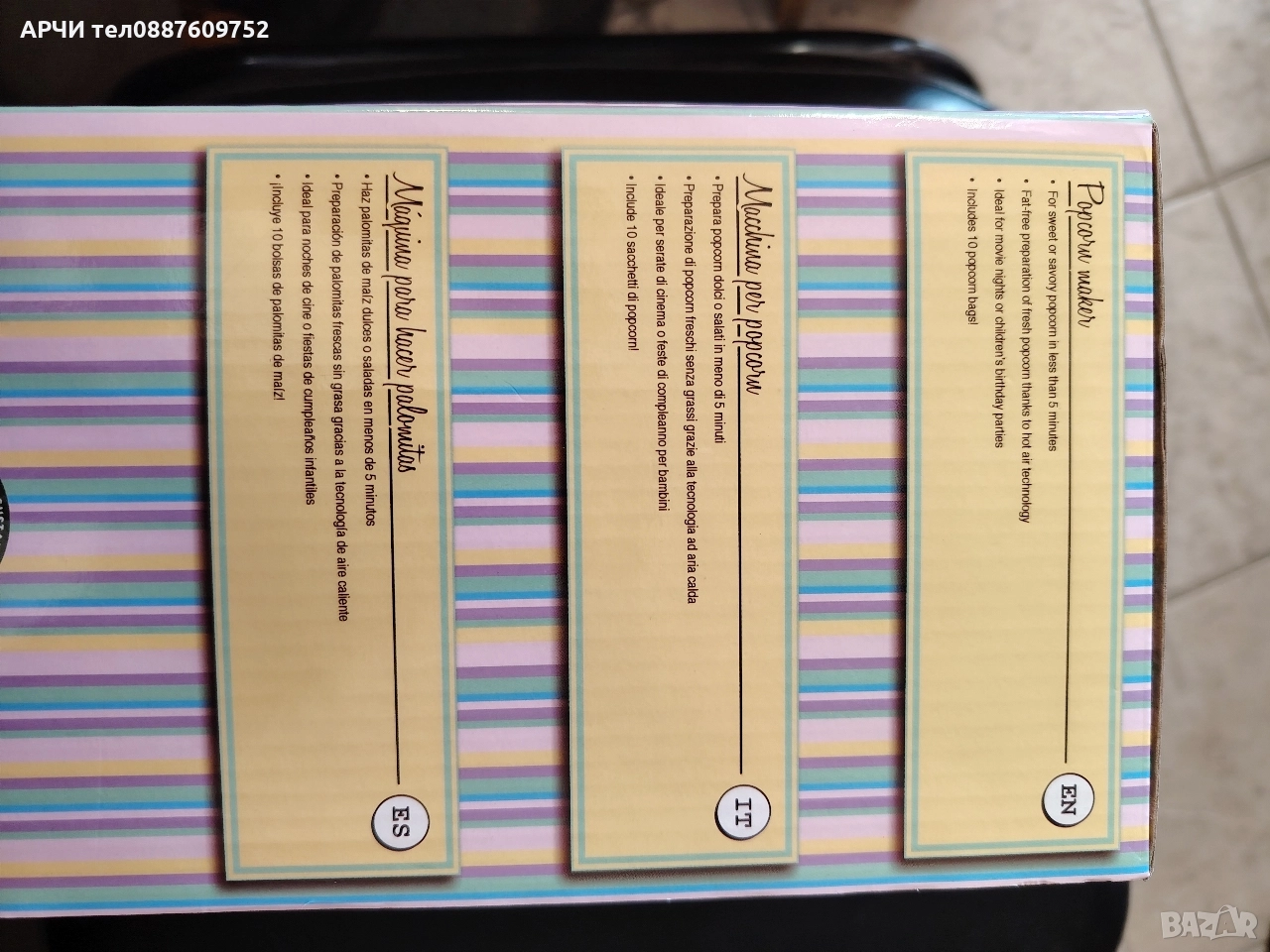 Безопасност и употреба: вградена защита от прегряване с незабавно изключване, максимална употреба 1 x мерителна чаша с пуканки на процес