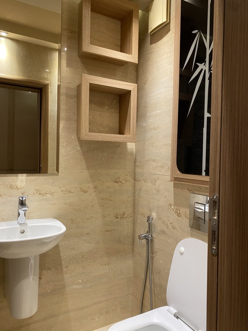 Банята е оборудвана с две мивки, вграден душ и тоалетна. В апартамента има и втора тоалетна с умивалник.