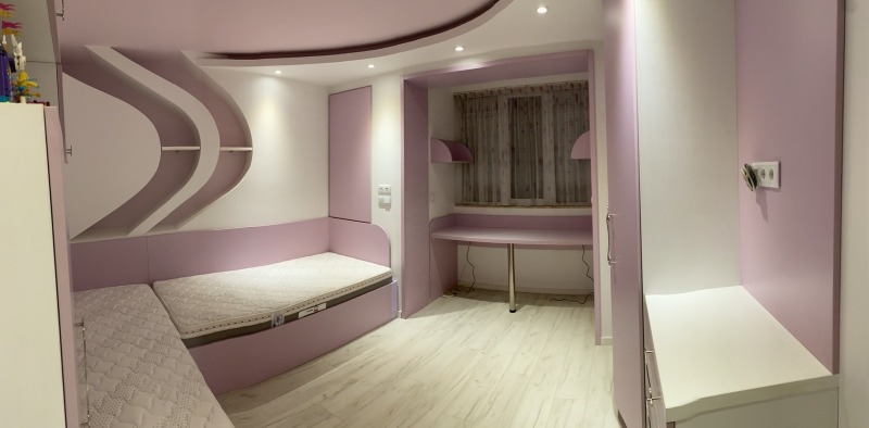 Детската стая е оптимално усвоена откъм шкафове и гардероби, като бюрата са разположени пред южния прозорец за максимална осветеност.