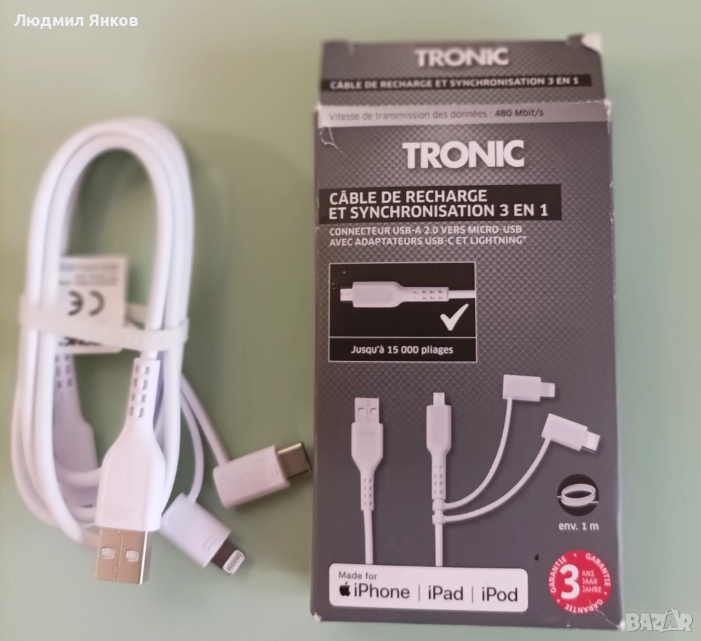 8. TRONIC 3-в-1 кабел (USB-A към MicroUSB + USB-C + Lightning) – 1 м, 480 Mbps – 15 евро.