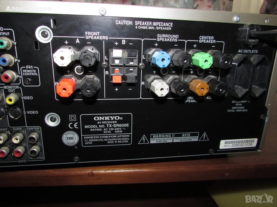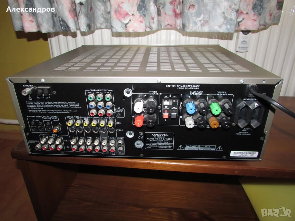 Качествен 6.1 ресивър за домашно кино Onkyo TX-SR600E. С много добър външен вид и отлично функциониращ. Декодери: Dolby Pro Logic IIx-Decoder, DTS, DTS-ES Discrete/Matrix 6.1, DTS 96/24, DTS NEO:6, Dolby Digital EX. Изходна мощност: в режим кино 6x105w/6ohm ,в стерео режим 2x105w/6ohm. Произведен в Малайзия. 13кг. Цена 200лв.