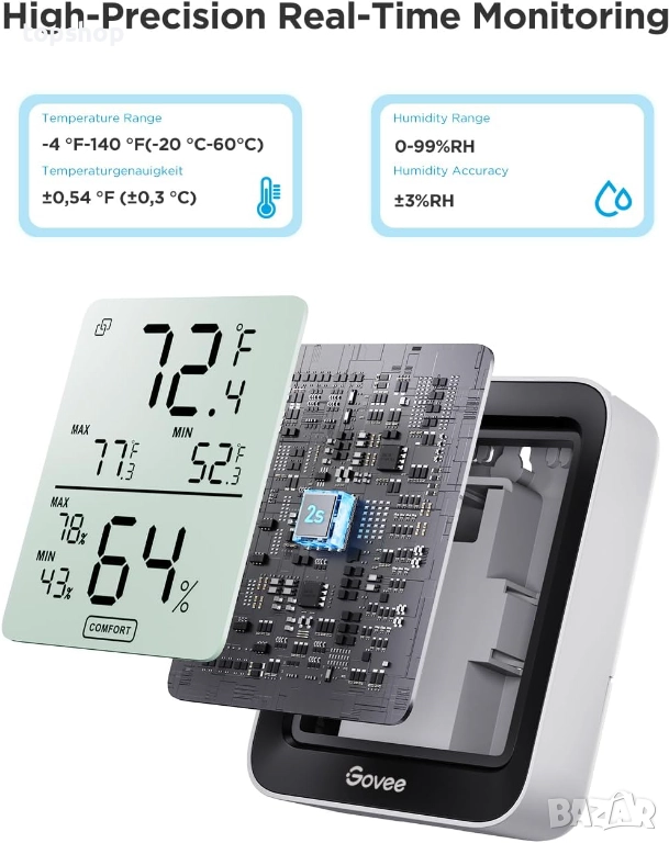 Нов Govee стаен термометър и хигрометър, Bluetooth цифров измервател на влажност на закрито с...