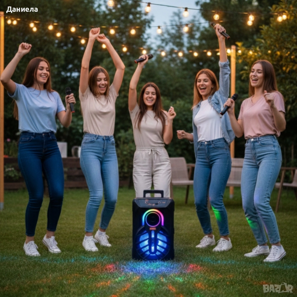 Размер на говорителя: 8.5"; Размери на колоната: ок. 36 × 21 × 17 см; Мощност: 8W; Корпус: ABS пластмаса, защитна решетка, дръжка за пренасяне; Свързаност: Bluetooth, USB, TF/SD, AUX, FM радио; Батерия: 1 бр. вградена акумулаторна литиево-йонна батерия (ориентировъчно 1200–1800 mAh), зареждане чрез USB кабел; Функции: караоке с микрофон, RGB LED светлини, дистанционно управление; Преносимост: лека, удобна, подходяща за закрито и открито; Поддръжка: лесно почистване, стандартно зареждане; Съвместимост: всички телефони и устройства с Bluetooth.