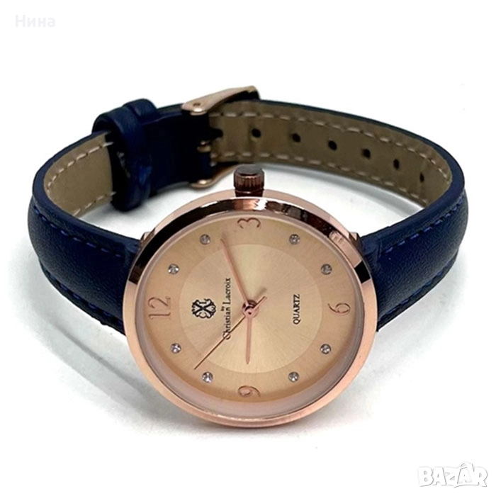 Часовник Christian Lacroix - стил, вдъхновен от висшата мода за всеки повод. Корпус от цинкова сплав в цвят розово злато (3,3 см), стъклени камъни, неръждаема стомана, PU каишка (17,5 см). Обща дължина: 23,5 см;
