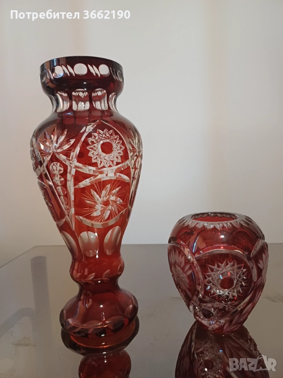 Красиви вази в червен цвят и множество фигурални изрязвания на кристала.Без увреждане. Високата е 29 см., а е широка в отвора 9 см., докато малката е висока 12 см. и широка 5 см.Част от лична колекция. Моля, разгледайте и другите ми обяви!