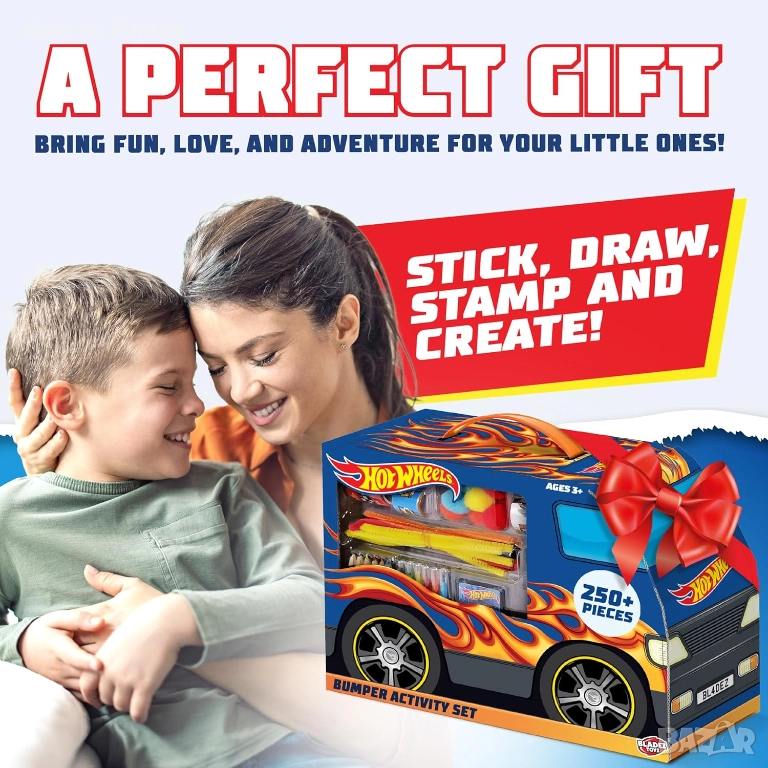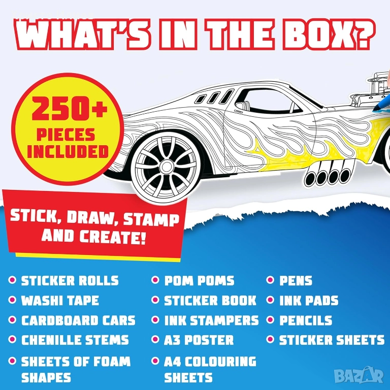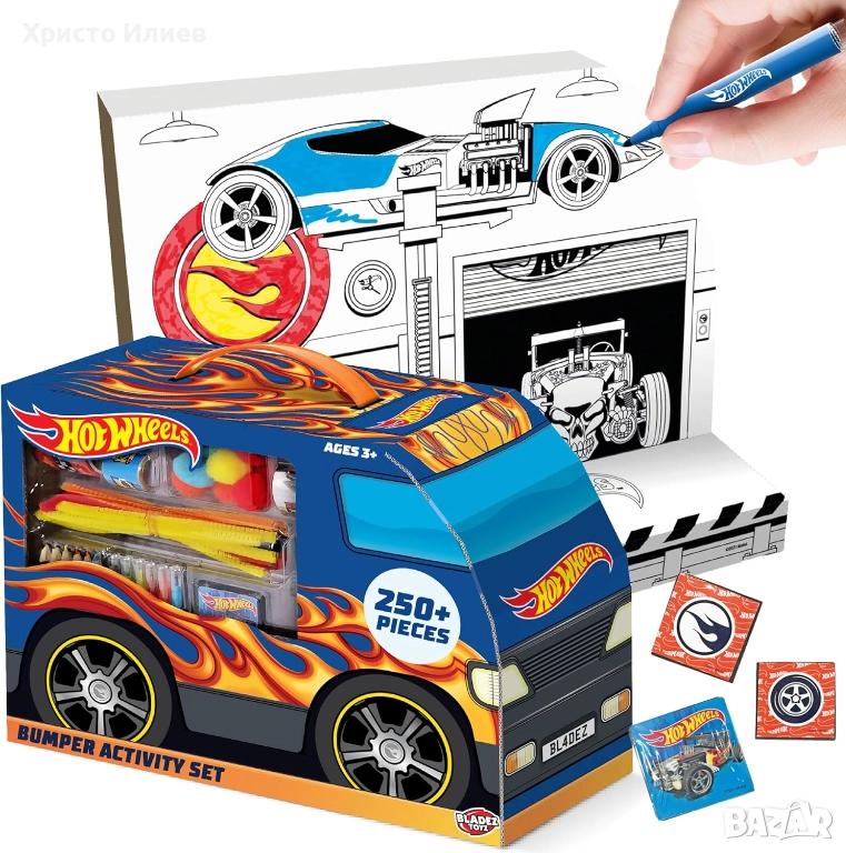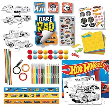 Комплектът включва още страници за оцветяване и картонени колички Hot Wheels.
