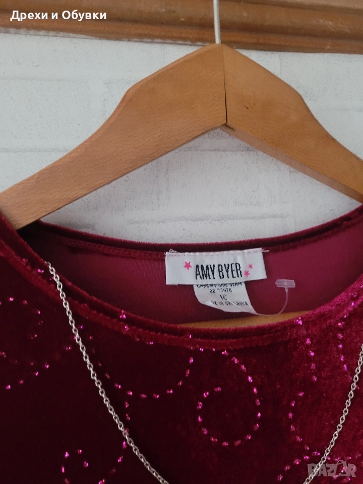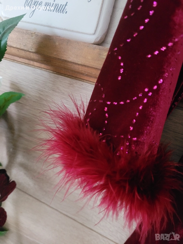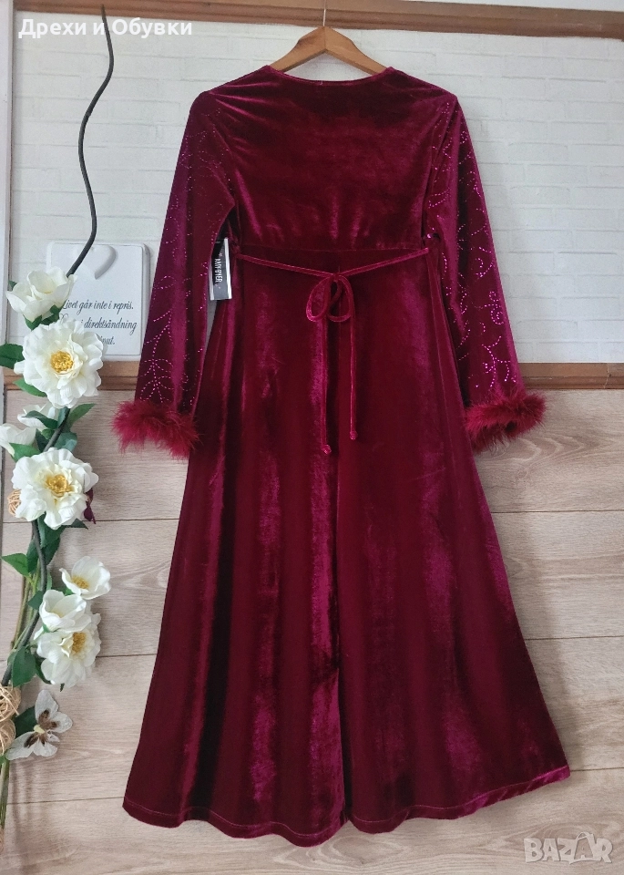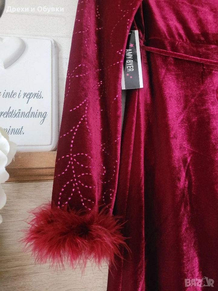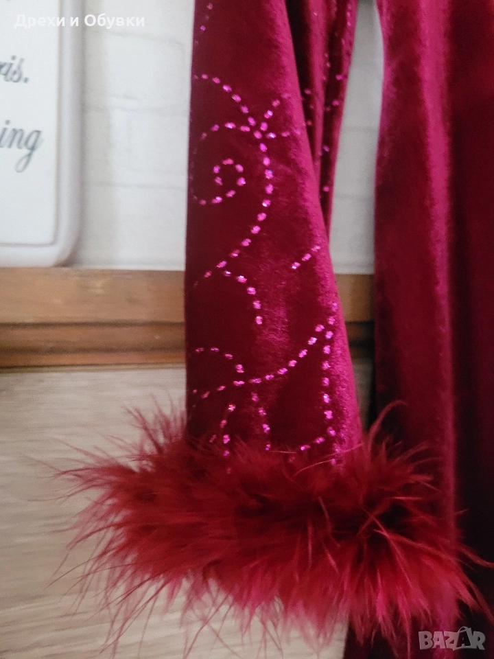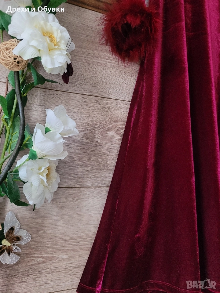 Официална бордо кадифена рокля с декоративни ръкави с естествени пера AMI BYER. Нова с етикет! Стилна и впечатляваща дълга рокля в наситено бордо. Горната част и ръкавите са декорирани с фини блестящи орнаменти, които придават нежна празнична визия. Под бюста минава ред пайети за подчертаване на силуета. Ръкавите завършват с пухкави маншети в същия цвят – истински акцент, който прави модела уникален. Отзад се връзва с коланче. Роклята е изработена от меко, луксозно кадифе, пада красиво и подчертава силуета, без да стяга. Подходяща е за официални събития, празнични вечери или тематични тържества. Производство: Шри Ланка. Размер: М Гръдна 86-92см ( еластан в материята), дължина 108см Перфектна за дами, които обичат ефектни и елегантни визии. Цена 45лв . ( 23.01EURO) Още снимки в коментар.