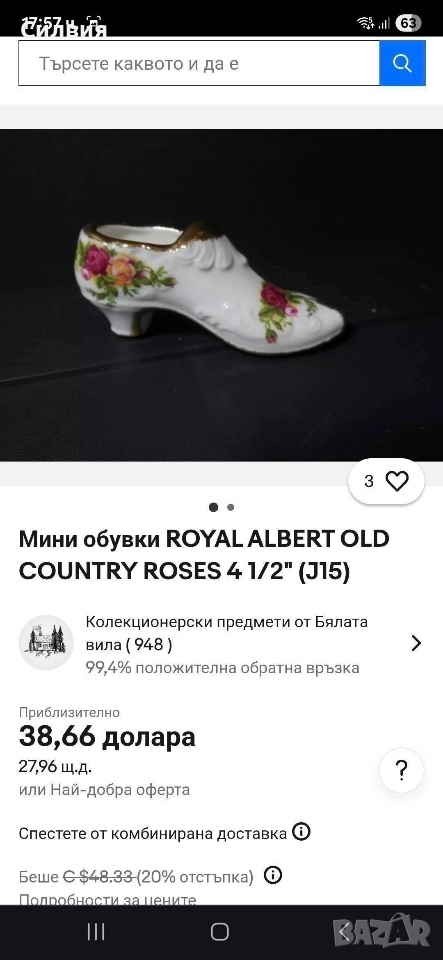 Royal Albert е идеална за всеки повод. Украсена със зашеметяващ мотив на рози и изработена от висококачествен костен порцелан, тази мини фигурка на обувка е задължителна както за колекционери, така и за любители на декора. Сложните детайли и ярките цветове я правят забележително допълнение към всяка стая. Независимо дали сте фен на флоралните мотиви или просто цените фината изработка, тази фигурка със сигурност ще ви впечатли.