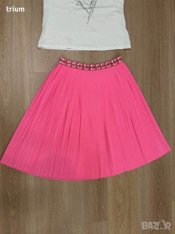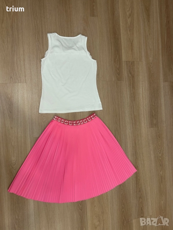 Комплект за момиче с красива плисирана пола с лого Guess на ластичен колан, наситен розов цвят и подходящ потник Guess с апликации с камъчета, размер 16 години. В отлично състояние, ползвани са само 2 пъти, като нови са, нямат следи от употреба.