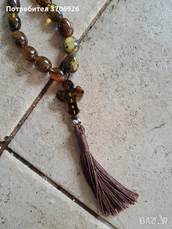 Броеницата е нова и е християнска - на пискюла има кръст. От натурален кехлибар 33 зърна , цвят тютюн. Тегло 46 гр. , обиколка към 45 см.