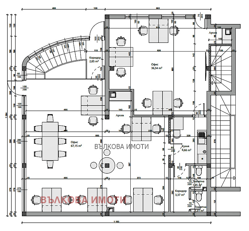 ВЪЛКОВА ИМОТИ дава под наем 150 кв. м помещение на партер, в сграда ново строителство, на тиха улица в района под Аязмото. Състои се от едно помещение 36. 34 кв. м, второ помещение 67. 15 кв. м, коридори, два санитарни възела, кухня и тераса. Помещенията са взаимосвързани, но имат и два самостоятелни входа- при необходимост. Извършва се цялостен ремонт и модернизиране. С много голяма витрина и осветеност.