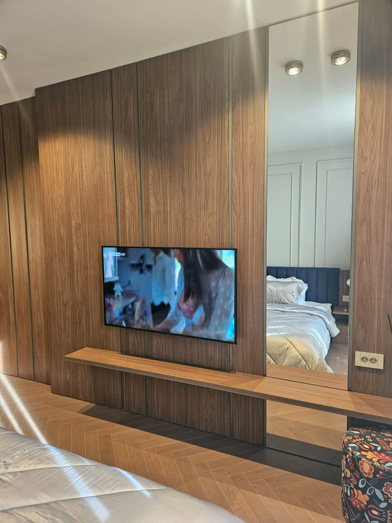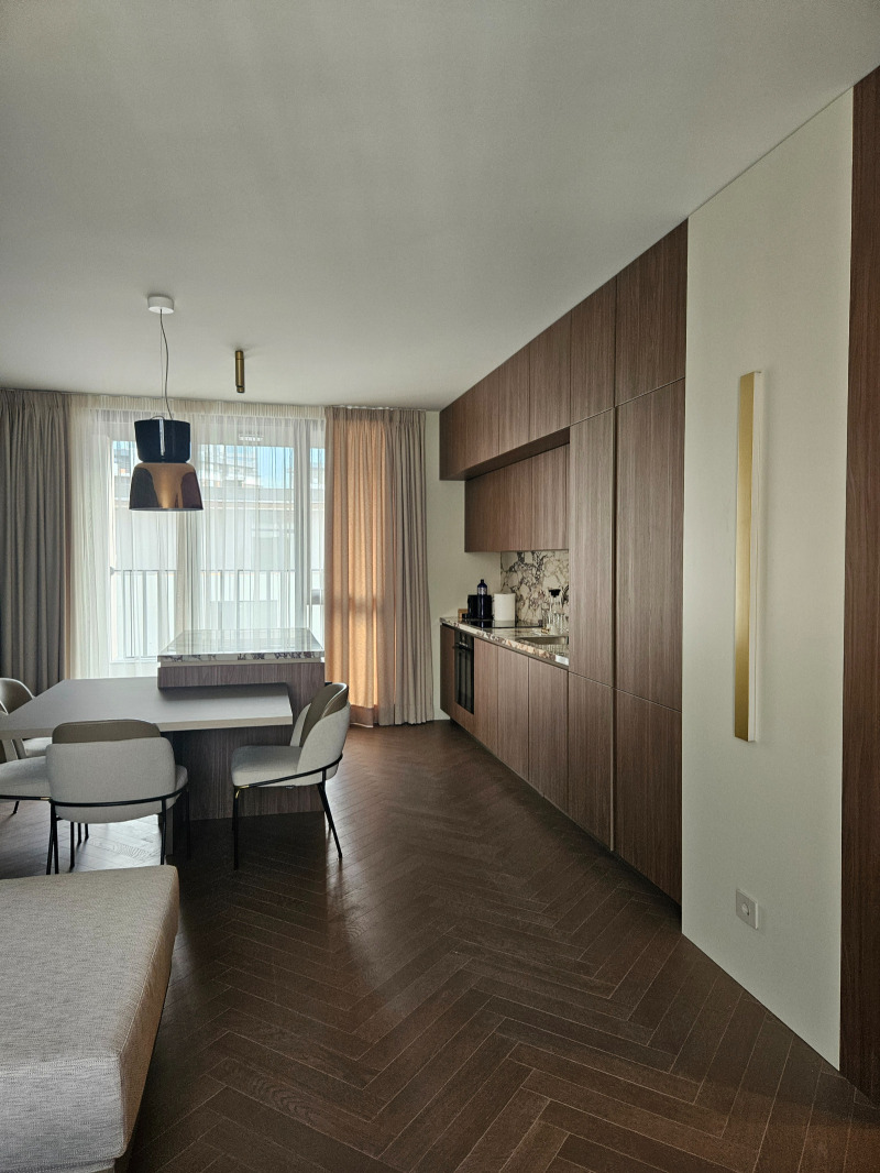 Дизайнерски обзаведен с мебели по поръчка, в модерен и авангарден стил, най-висок клас вградени електроуреди Bosch и с най-високо качество довършителни материали на водещи производители, изцяло италиански гранитогрес и санитария в баните.