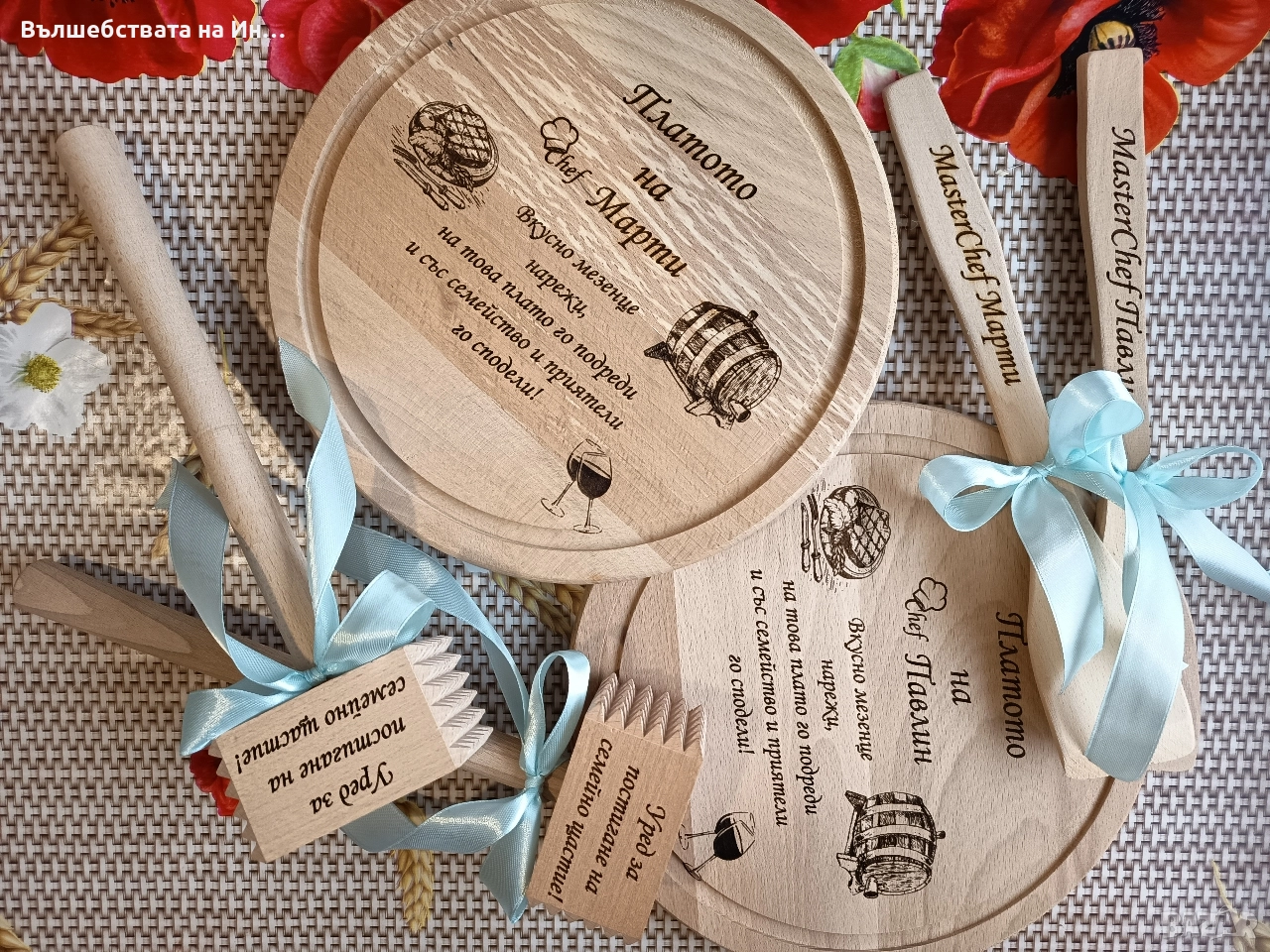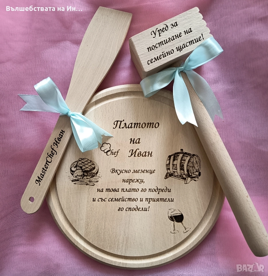 Персонализирани с лично послание плато за мезета, чук и дървена лъжица. Цена е за комплекта. При желание може да се персонализира и точилка