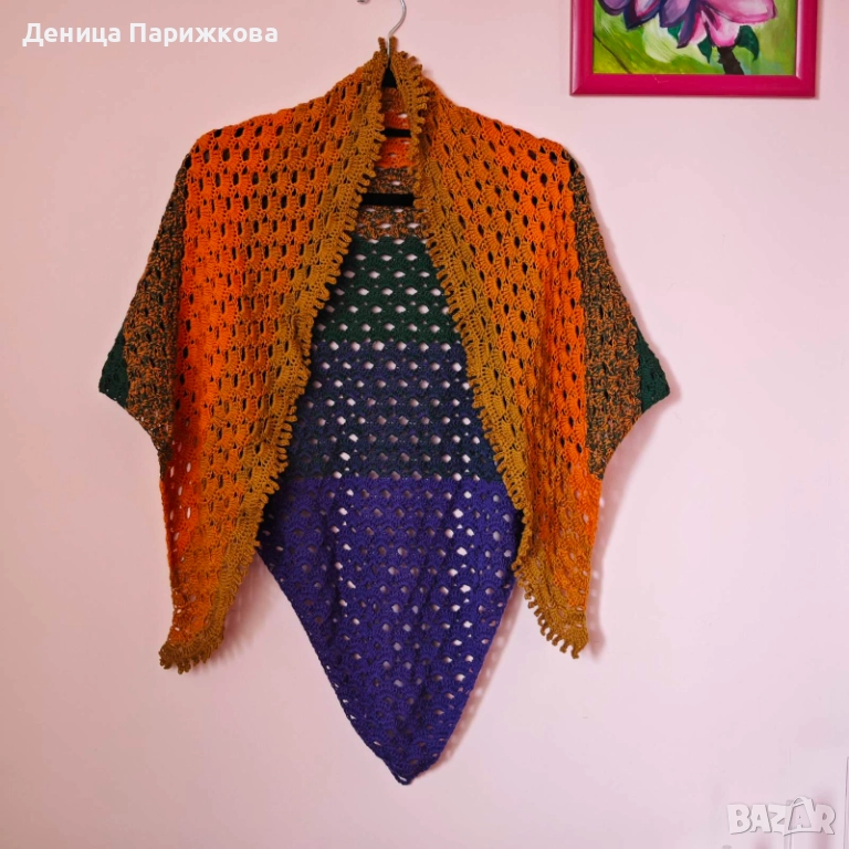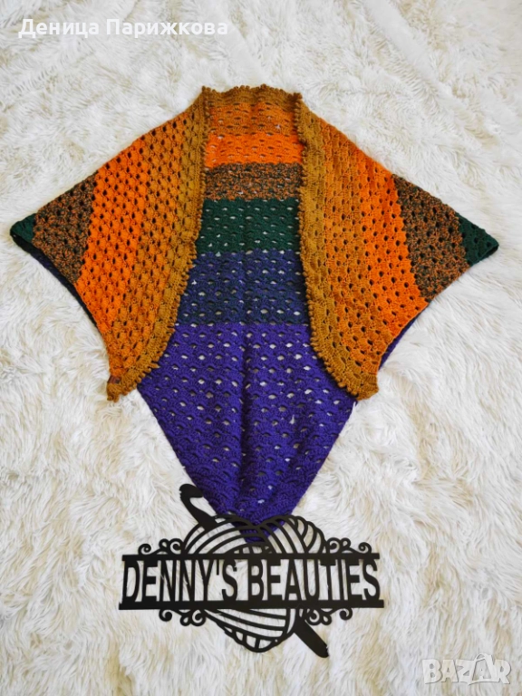 Триъгълен Шал/Наметка: Ръчно плетен с ресни.