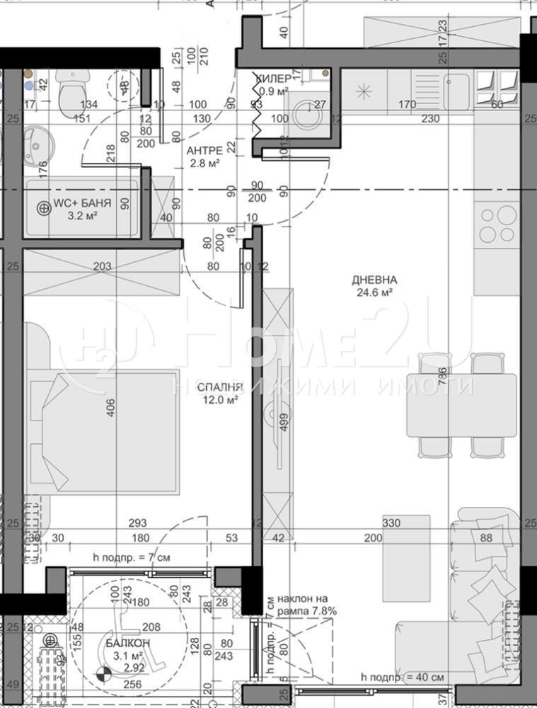 Дневна с кухненски бок, голяма спалня, баня с тоалетна, складово помещение в апартамента
